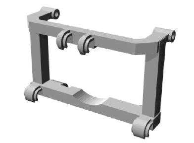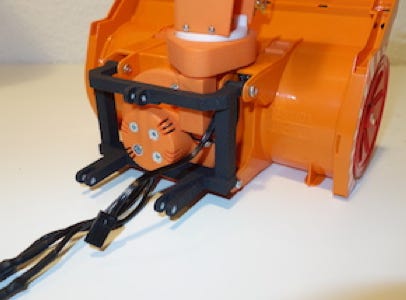 Zur Montage an der Raupe habe ich im CAD einen Rahmen gezeichnet, angelehnt an den Befestigungsrahmen den Westa bei den Doppelschneeschleudern verwendet. Davon hatte Eric bei einem Besuch bei Westa vor einigen Jahren gute Fotos gemacht. Bei den Halterungen am Schleudergehäuse habe ich die Bolzen entfernt und genau zentrisch 3 mm Bohrungen angebracht (siehe Foto unten). Am Rahmen habe ich sie dann mit M3-Sechskantschrauben befestigt.