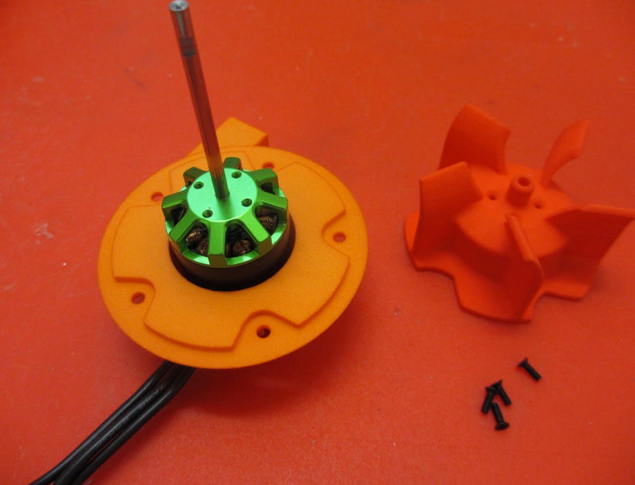 Für den Antrieb des Wurfrades und der Frästrommel habe ich einen relativ langsam laufenden und drehmomentstarken bürstenlosen Außenläufer gewählt. Dieser in den Bildern zu sehende Turnigy Motor ist inzwischen nicht mehr erhältlich. Ich habe die Druckteile im Januar 2021 auf einen ähnlichen Motor genau passend abgestimmt. Die Welle muss dabei durch einen längere Welle ersetzt werden, was bei den bürstenlosen Motoren glücklicherweise gut möglich ist. Zum Lösen der Madenschraube habe ich die Welle mit einem Lötkolben erhitzt, damit sich die Schraubensicherung löst. Nach Entfernen des Sprengringes konnte ich die Welle auf der Ständerbohrmaschine auspressen, dazu habe ich die Glocke auf dem Maschinenschraubstock aufgelegt und im Bohrfutter einen 3mm-Rundstab eingespannt, natürlich ohne die Bohrmaschine einzuschalten. Auf der Drehbank wurde dann bei der neuen 3 mm Edelstahlwelle hinten eine Nut für den Sprengring eingestochen. Außerdem habe ich für die Madenschraube am Motor und am Ritzel entsprechende Flachstellen in die Welle gefräst. Anschließend habe ich den Motor und die Druckteile verschraubt, das Wurfrad wird mit den Senkkkopfschrauben, die beim Motor mitgeliefert werden, verschraubt (siehe Fotos).