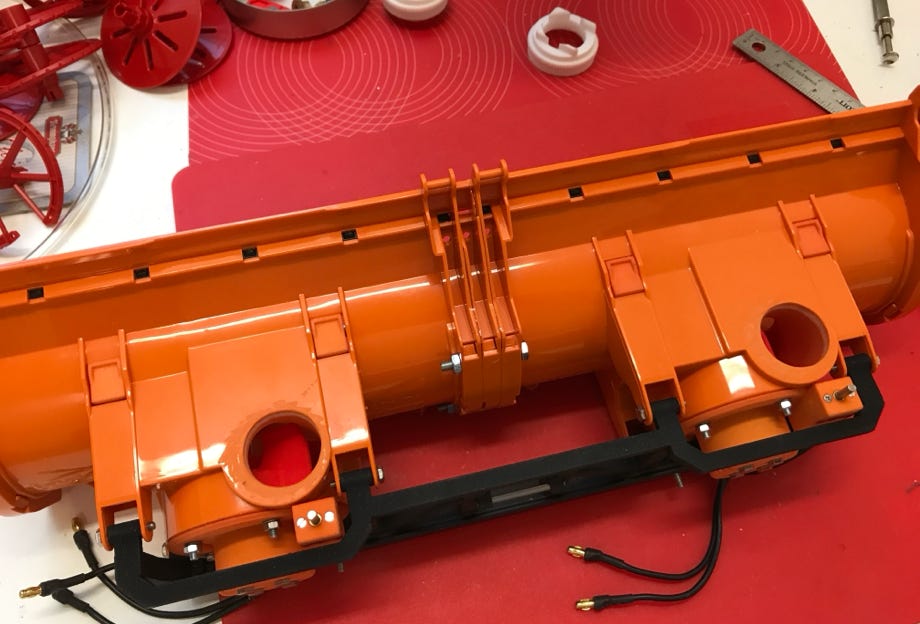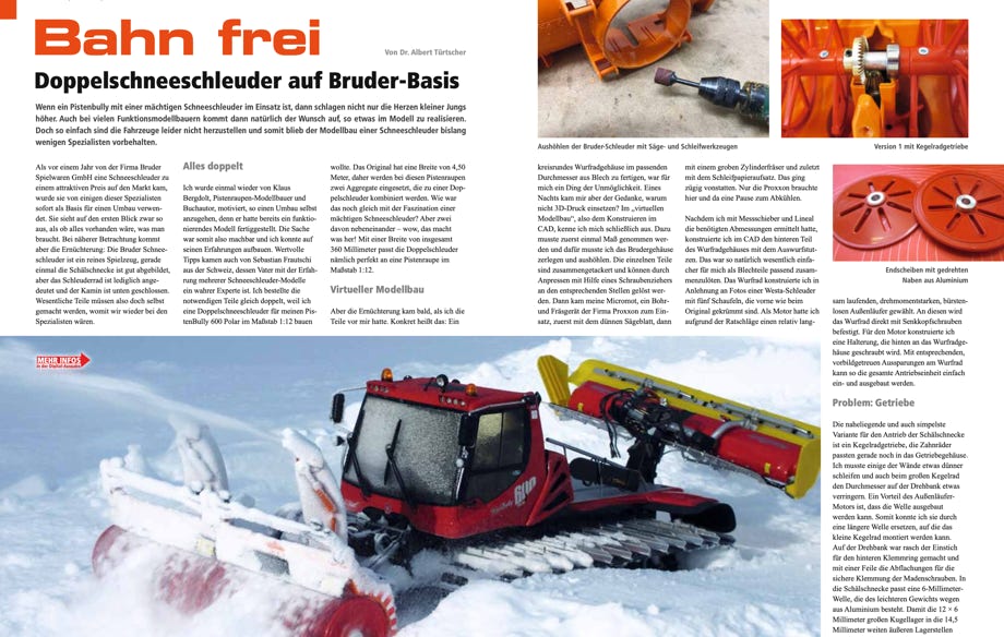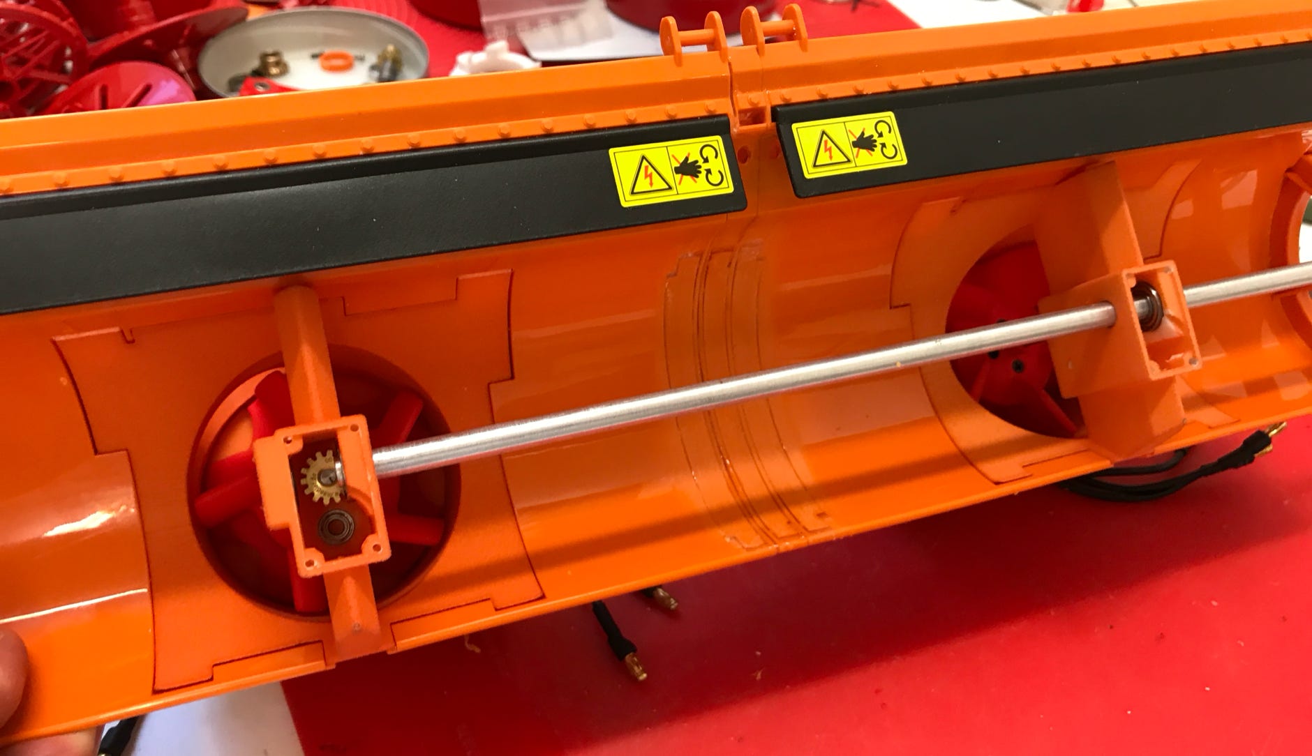 Mehrere Kollegen haben bereits einen Umbau durchgeführt, und Klaus Bergdolt hat darüber ausführlich in der Truckmodell 2/2017 berichtet. Motiviert von seinem Bericht beschloss auch ich einen Umbau, aber es sollte eine Doppelschneeschleuder werden, und zufällig von der Breite perfekt an ein PistenBully Modell in 1:12 passt. Klaus hat das Wurfrad und Gehäuse aus Dünnblechteilen hergestellt, wozu mir die Kenntnisse und Maschinen fehlen. Daher habe ich diese Teile im CAD gezeichnet und drucken lassen.
