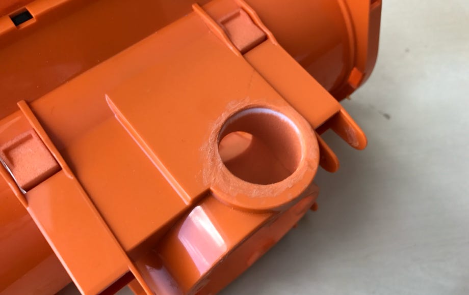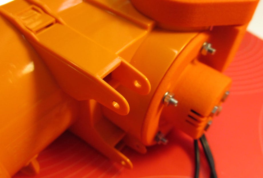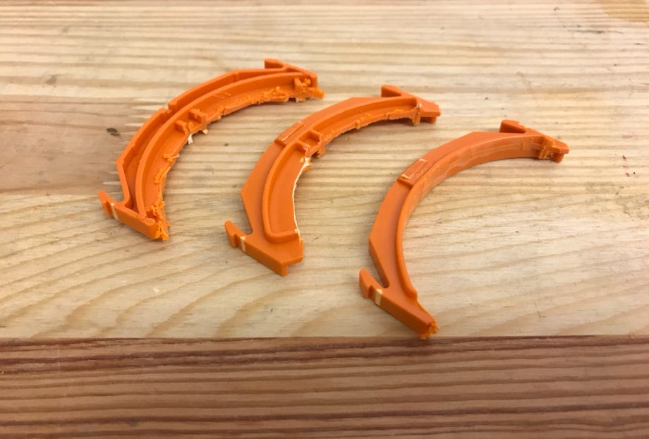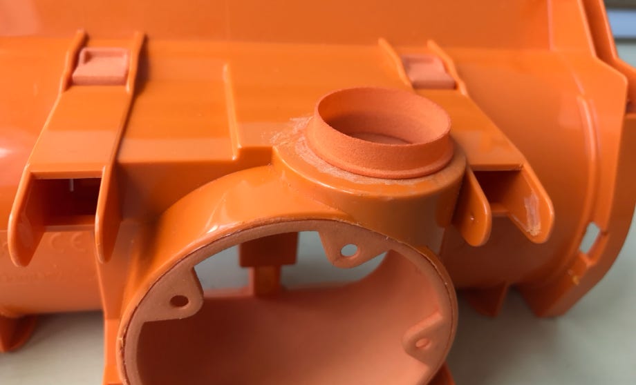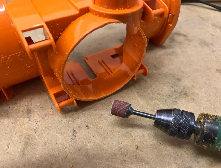 Zunächst muss die Schneeschleuder zerlegt werden: die Teile sind über Klipps miteinander verbunden, welche sich mit einem Schraubenzieher ein- bzw. auseinander drücken und lösen lassen. Die Klipps der Schälschnecken-Endscheiben werden später nicht mehr benötigt, ich habe sie daher kurzerhand abgezwickt. Nachdem die Schälschnecke zerlegt ist, kann das eingeklippste Mittelteil entfernt werden. Mit meiner Proxxon Micromot und entsprechenden Säge- und Fräseinsätzen habe ich dann das Gehäuse ausgehölt, siehe Bilder: