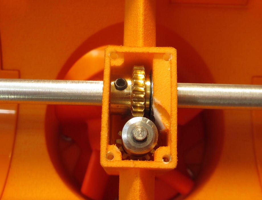 Ein Dünnring-Kugellager mit 25 mm Innendurchmesser erlaubt das Drehen des Kamins, die Verstellung erfolgt ferngesteuert über einen 1:50 Getriebemotor, der in das genau passende Gehäuse montiert wird. Mittels einer gedruckten Hülse wird das Kugelllager zuverlässig in der richtigen Position fixiert. Die Hülse wird mit dem Auswurfschacht und dem Innenring des Kugellagers verklebt.