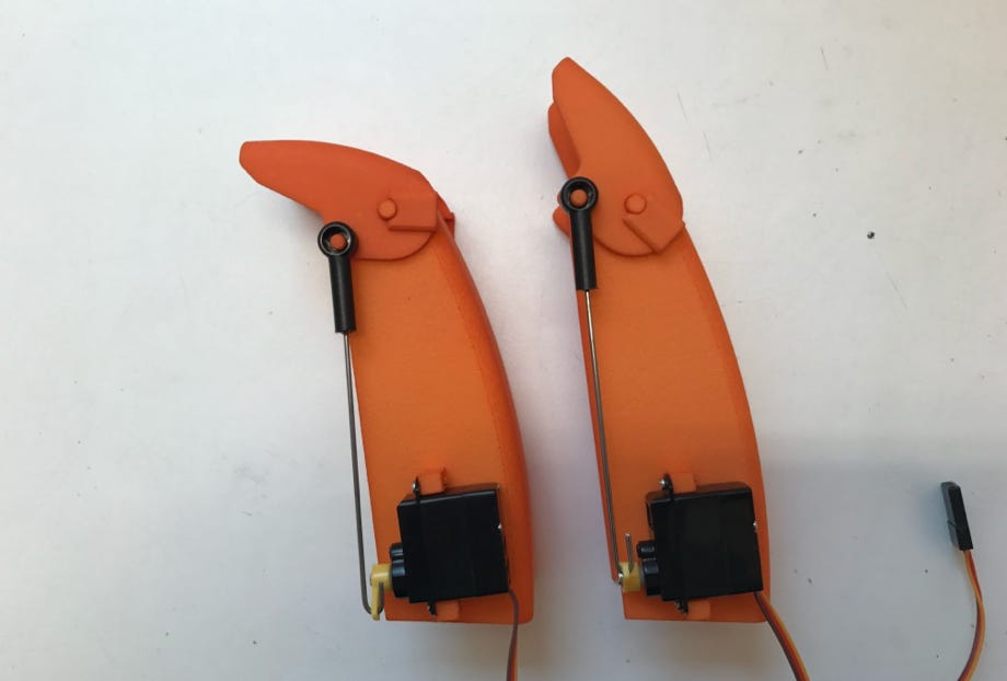 Bei Version 2 habe ich mit einem am Kamin montierten Servo eine recht simple ferngesteuerte Wurfweitenverstellung realisiert. Den 1 mm Stahldraht habe ich in die Nut der Verstellstange vom Bruderkamin geklebt. Sicher kann man das auch schöner machen und mit einer Hydraulikzylinderattrape tarnen, vielleicht mach ich das später noch.