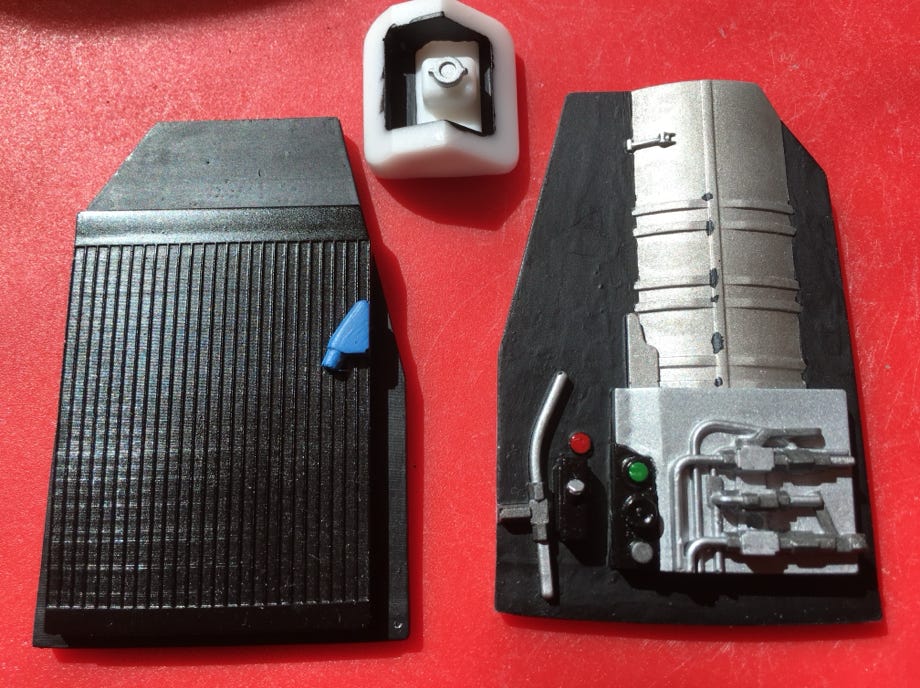Die Blechteile des Rucksacks wurden im CAD erstellt und dann aus speziellem Riffelblech gelasert. Der Auspuff wurde als 3D-Druckteil gefertigt. Ein paar weitere Details wie zB der Tankstutzen für den Urea-Tank wurden als Gussteile erstellt. Dazu wurden sie zuerst in High Definition Acrylate gedruckt, einer neuen Drucktechnik die feinste Details zulässt, und dann in Silikon abgeformt. Wegen der großen Lufteinlässe habe ich die sichtbaren Details hinter den Lufteinlässen in CAD modelliert und drucken lassen. Fahrerseitig sieht man die Hydrauliksteuerung zum Anheben der Fahrerkabine und Plattform, und beifahrerseitig befindet sich der Motorkühler inlusive Vorwärmstecker.