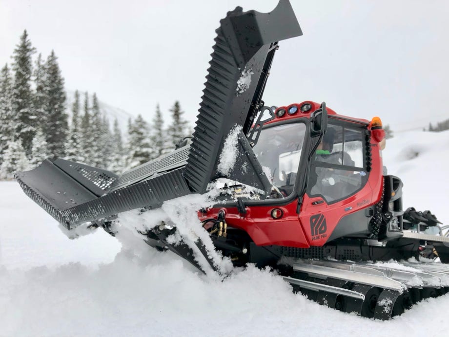 Die Karosserie und eine fetzige Lackierung allein machen noch keinen ParkPro. Für die Parkbearbeitung sind enorme Verfahrwege von Schild und Fräse notwendig, und deshalb hat Kässbohrer für die ParkPro-Version einen verlängerten Schubrahmen und ein spezielles Räumschild entwickelt. Diese Teile zu machen entpuppte sich als schwieriger und aufwändiger als ich ursprünglich dachte.