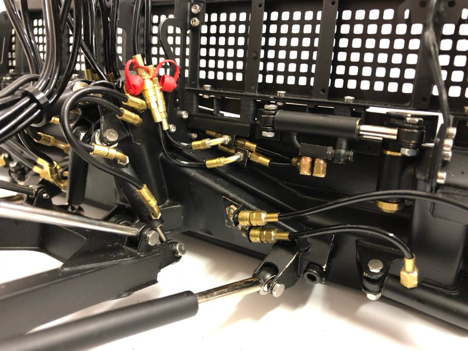 Die Betätigung der Transportgabel erfolgt natürlich ebenfalls hydraulisch, dafür kürzte ich einfach die alten Hubzylinder auf 10 mm Hub. Die Hydraulikanschlüsse machte ich aus gedruckten Messingteilen so original wie möglich. Aufgrund der Schlauchdimensionen beim Modell können sie nicht genau maßstäblich verkleinert werden.