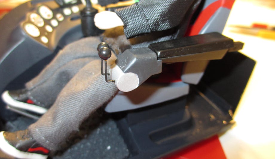 Die ParkPro haben im Gegensatz zu den anderen PistenBullys eine Hebelsteuerung, weil damit das Fahrzeug im Park einfacher manövriert werden kann. Also kam auch bei meinem Modell die Lenksäule raus und eine Hebelsteuerung an die Armlehne. Statt der Lenksäule hat der ParkPro eine Abstützung für die Füße.