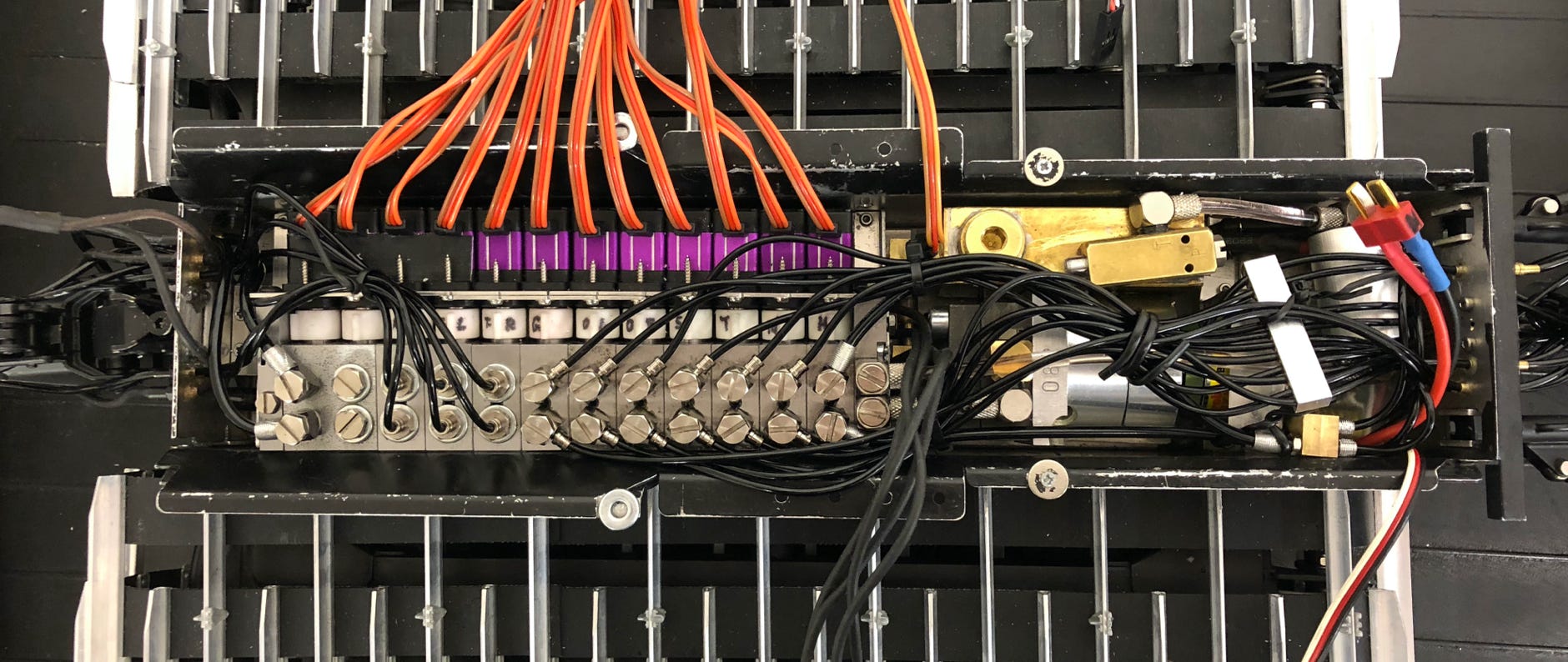 Mit der Transportgabel kam eine weitere Hydraulikfunktion dazu, aber die bestehende Anlage konnte ich beim besten Willen nicht mehr erweitern. Ich entschied mich für einen Ventilblock von Modellbau Tobias Braeker, der sicher zum Hochwertigsten zählt, was am Markt zu haben ist. Damit konnte ich dann auch noch weitere Hydraulikfunktionen umsetzen, wie die oben erwähnte Neigung der Heckfräse. Und als Tüpfelchen auf dem i sind nun auch die beiden Seitenfinisher getrennt einklappbar, so wie beim Original. Das sind dann mit der Schwimmstellung für die Fräse insgesamt 12 Hydraulikventile und damit der größte Block, den Tobias Braeker bislang ausgeliefert hat. Mit Fahrtregler, Pumpe und Fräswelle sind damit sämtliche 16 Steckplätze des Scaleart Commander Empfängers belegt.