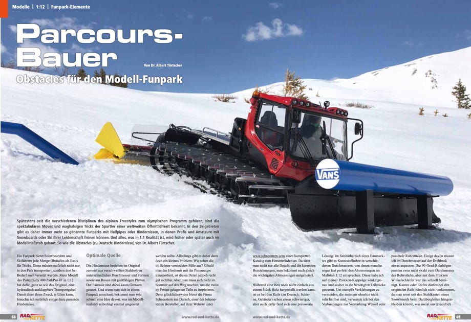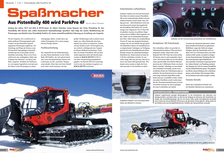Im Fachmagazin Rad & Kette 1/2018 und 2/2018 ist ein zweiteiliger Artikel von mir über den Bau des PB400 ParkPro 4F veröffentlicht worden. Teil 1 ist über den Bau der Karosserie, und Teil 2 über die Anbaugeräte und Hydraulik.