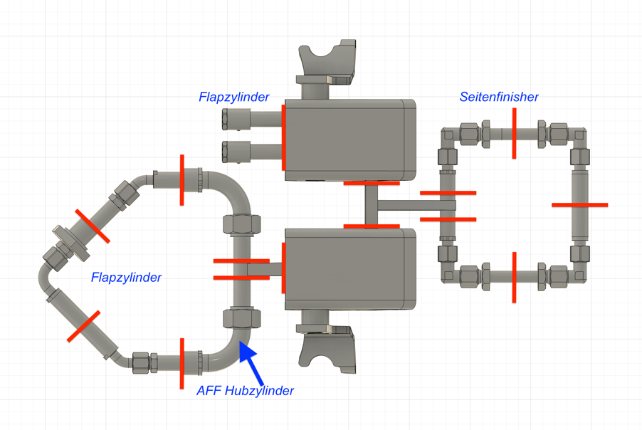 Auf den Bildern unten sind die Anschlüsse am Hubzylinder und an den Seitenfinisherzylindern zu sehen: