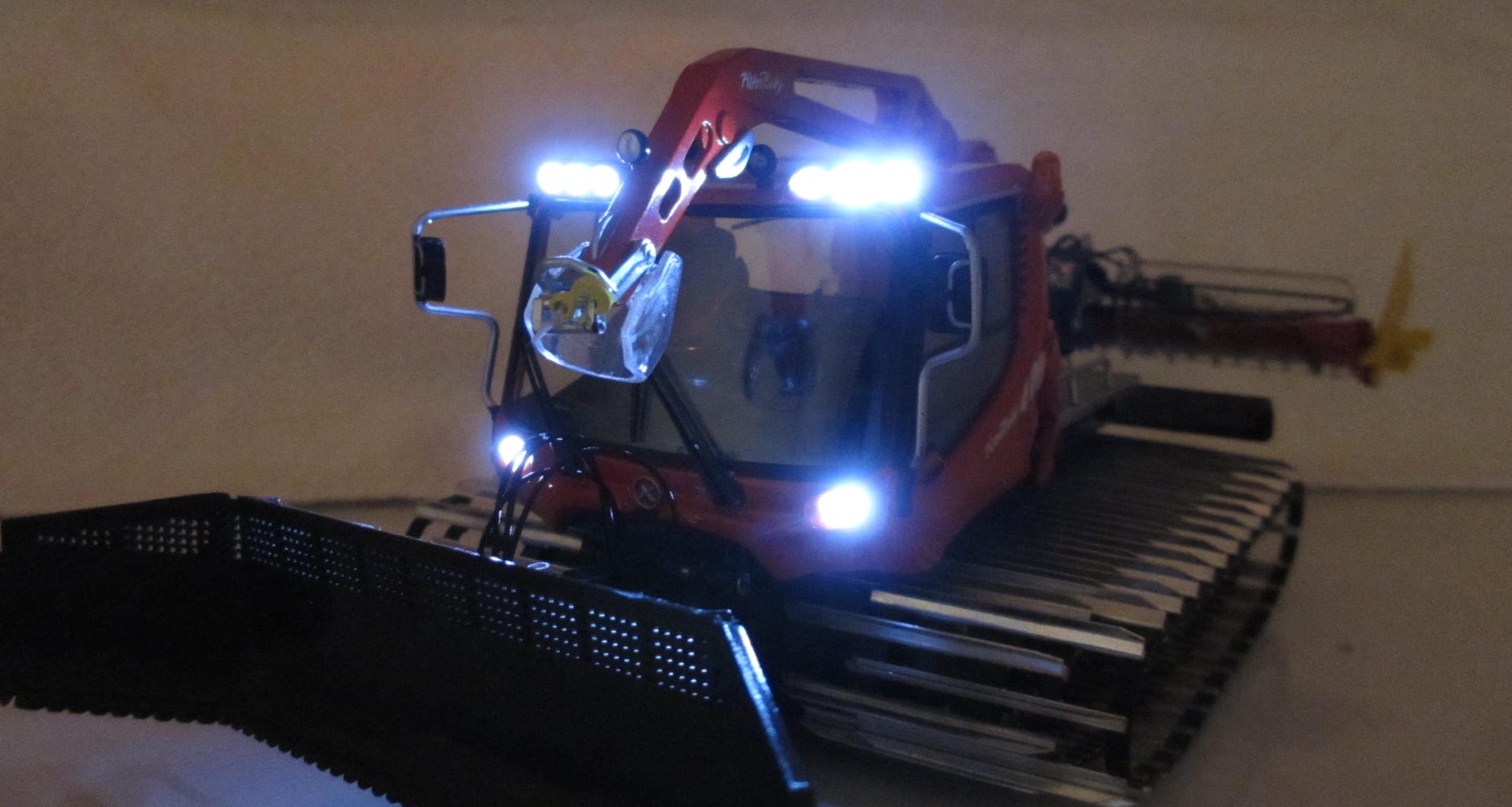 Although the Jaegerndorfer PB 400 W is a ready to run model we modified and improved it. For example new tracks were made, and the lifting functions for the blade and tiller were optimized. We also added rotating beacons with a realistic rotating light effect and LEDs for the roof lights. A comprehensive test report of Klaus Bergdolt in the German magazine Truckmodell 3/2015 motivated us for this project.