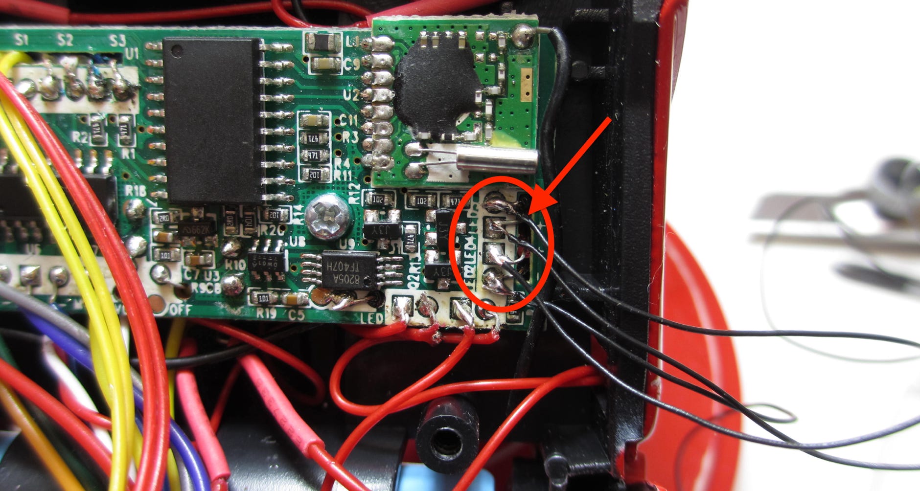 Contact points on the board for soldering the wires for the additional LEDs