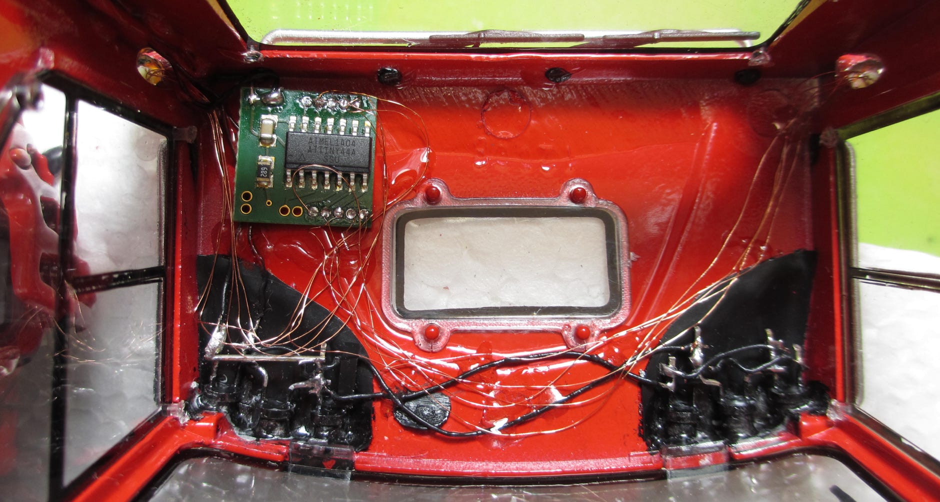The originals work mainly at night, therefore good lights are a must. Unfortunately JC only fitted the model with LEDs fpr die lower parking lights, which are of no significance for the actual operation. Thus we added LEDs for the 6 head lights on the roof. We measured the voltage for the LEDs on the board with 2.7 V, and a subsequent test showed that the circuit can handle additional standard 3 mm LEDs.