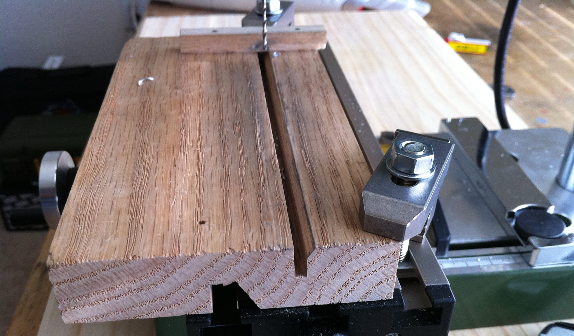 Mit dem Koordinatentisch kann man sehr gut die genaue Bohrposition einstellen, und dann bohrt man bei allen Stegen einer Kettenseite dieses Loch. Dann wird das nächste Loch eingestellt, und wieder alle gebohrt. Klar geht das auch ohne Koordinatentisch, bei den ersten Ketten hatten wir die Schablone noch mit Zwingen befestigt. Da ist aber das Einjustieren etwas mehr Fummelei.