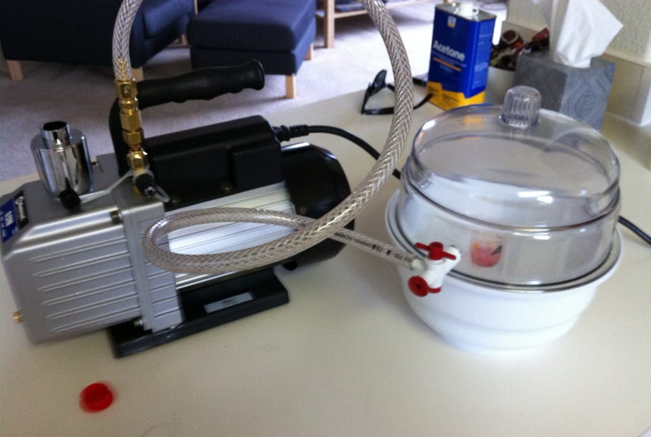 Als Vakuumpumpe verwende ich eine Pumpe, wie sie in KFZ-Werkstätten zur Befüllung von Klimaanlagen verwendet wird.