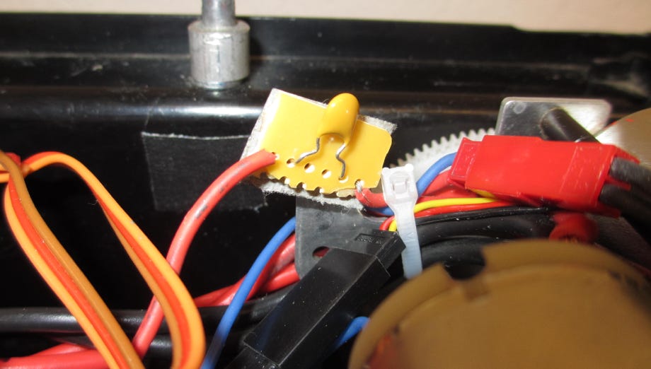 Wir haben dafür eine PTC-Sicherung mit 0,25 A verwendet: diese erhitzt sich durch den Blockadestrom und unterbricht nach kurzer Zeit den Stromfluss. Wenn sie sich wieder abgekühlt hat, was durchaus 20 Minuten dauern kann, gibt sie den Strom wieder frei. Sie wird einfach in eine der beiden Versorgungsleitungen des Fräsenmotors gelötet. Diese Sicherung hat den Vorteil, dass man sie nicht auswechseln muss, wie das zB bei Schmelzsicherungen der Fall ist.