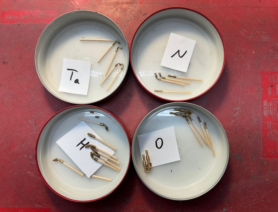 Nachdem die Anschlüsse zum Teil recht ähnlich ausschauen, habe ich sie entsprechend sortiert. Für das Lackieren in Silber habe ich sie auf runde Zahnstocher aufgespießt: