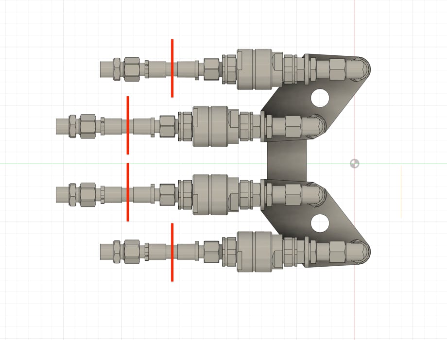 Um die Kosten für das Druckteil gering zu halten, sind alle benötigten Anschlüsse für den vorderen Geräteträger und das Schild zu einem Druckteil zusammengefügt. Diese müssen an den roten Linien im unteren Bild entsprechend aufgetrennt werden. Dazu eignet sich am besten eine Trennscheibe am Proxxon oder Dremel. Die rot eingefärbten Teile werden nicht benötigt.
