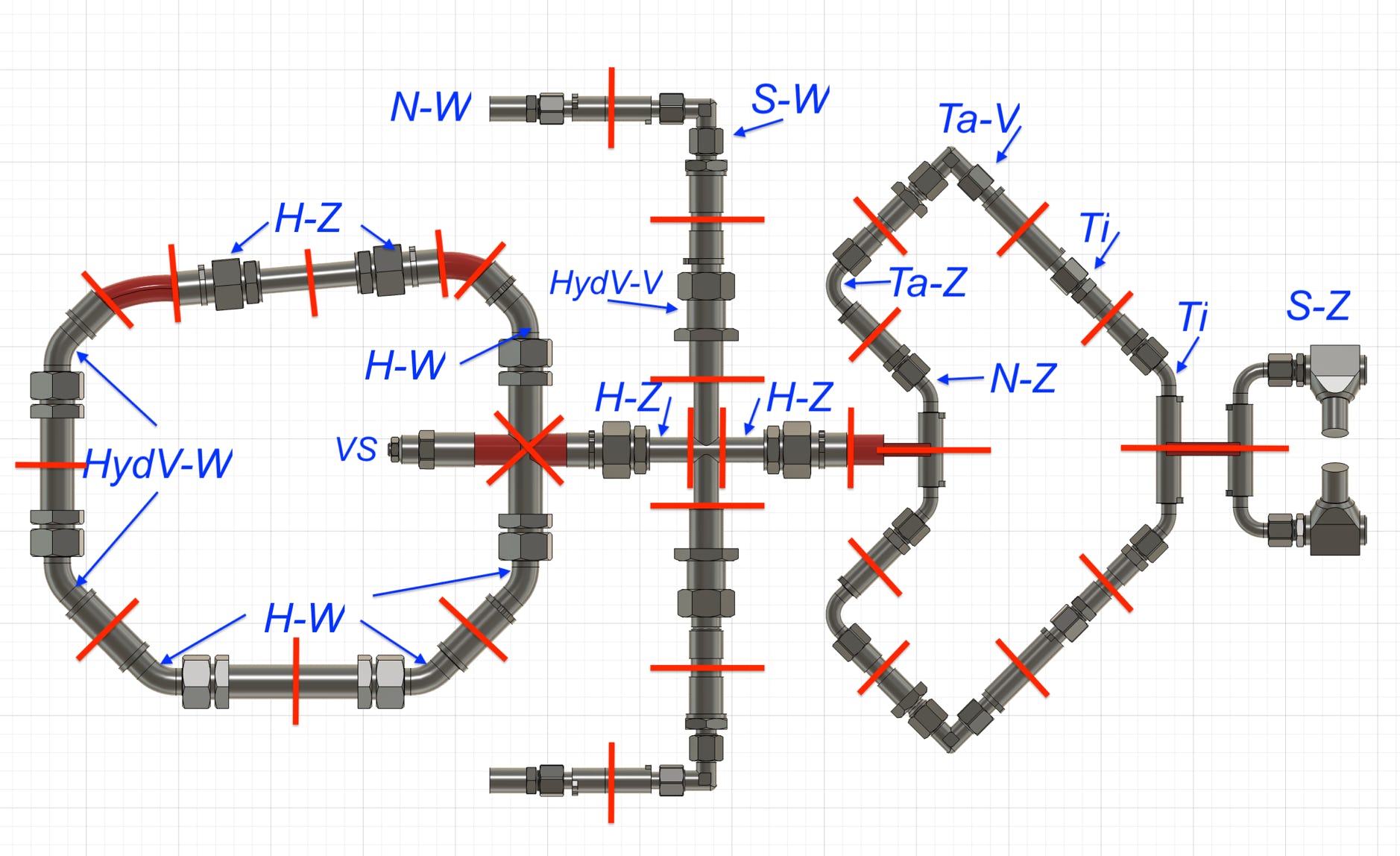 Ti: Tiltzylinder innen. Werden über Kreuz verbunden, mit den gebogenen Anschlüssen jeweils oben