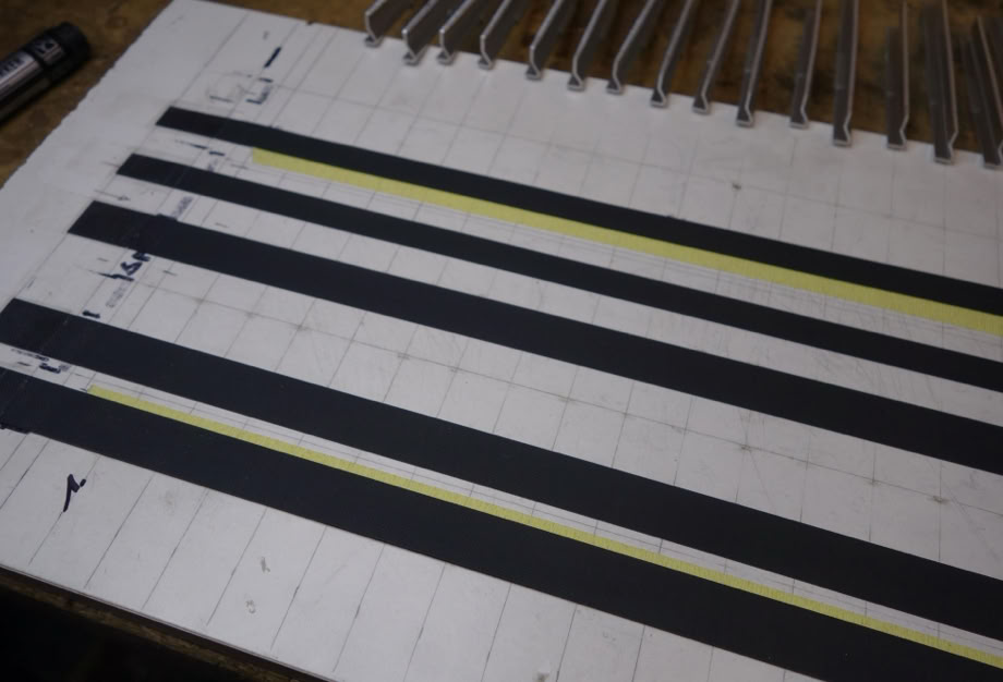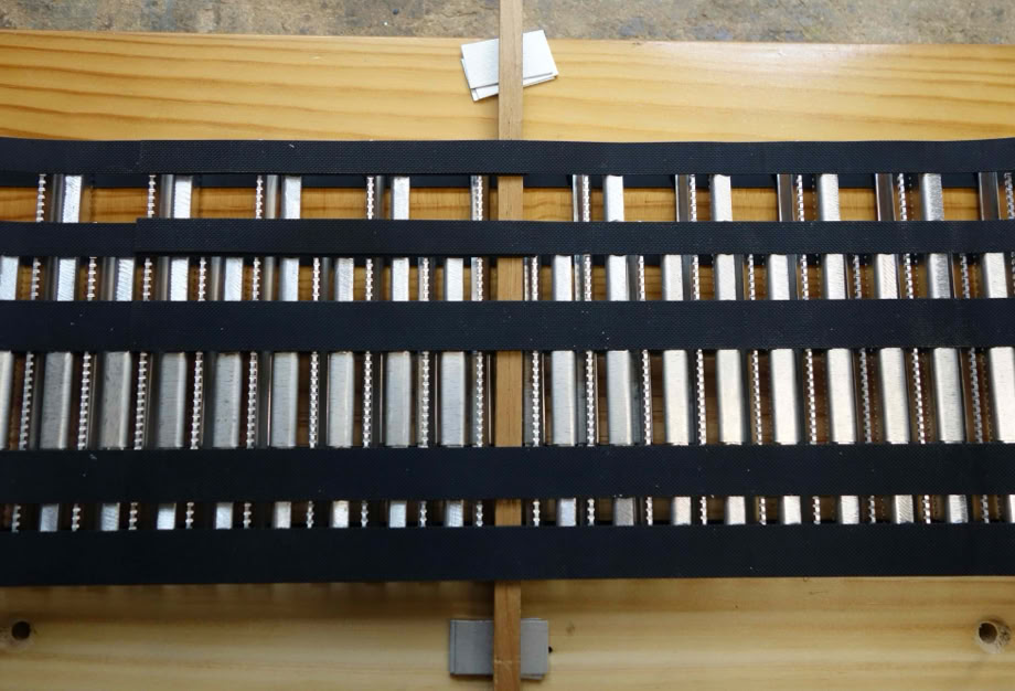 Da die profilierten Stege oft minimal schüsseln, päppe ich unter die zwei äußersten Bänder eine Lage Kreppband.