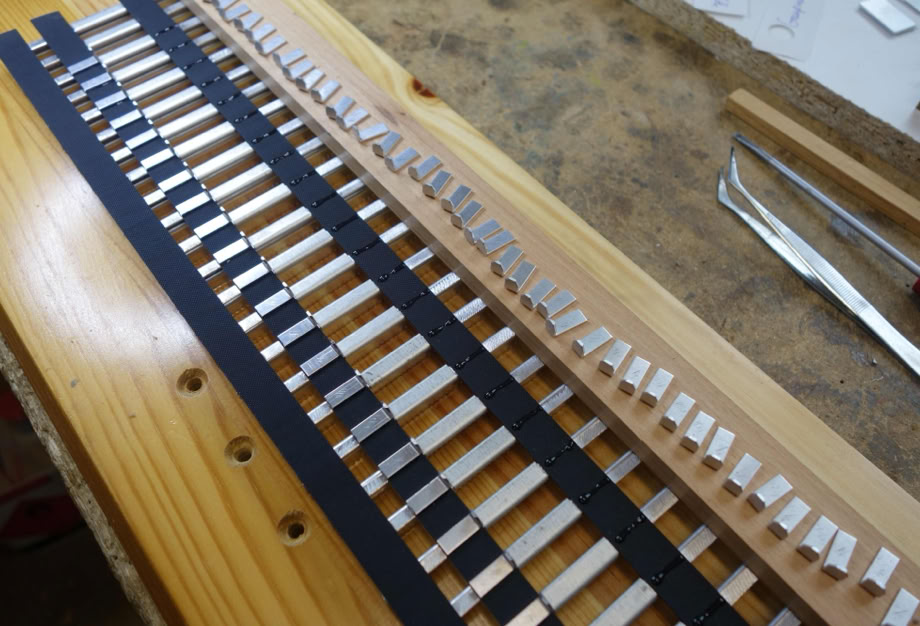 Zum eigentlichen Auflegen kommt jetzt das Brettchen ins Spiel. Das legt man parallel zur Kette und überträgt per Pinzette Bügel um Bügel. Anschließend wird die nächste Hälfte aufgelegt, bis dann alle 190 drauf sind. Erst jetzt richte ich per Schraubenzieher alles sauber in die Flucht und Winkel.