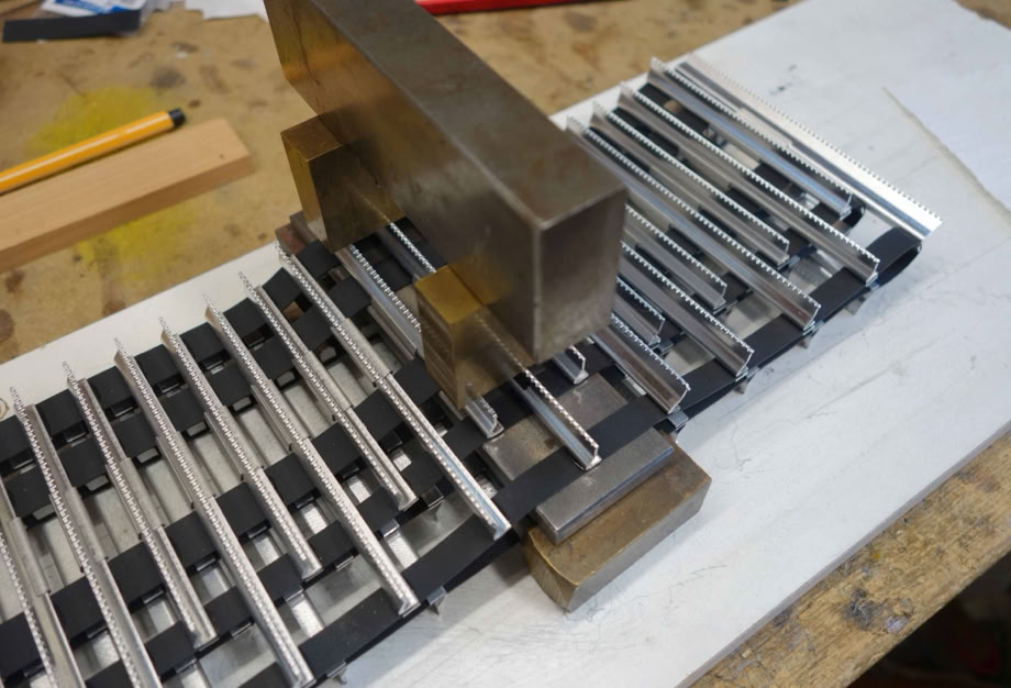 ..um dann auf einer Flachstahlunterlage alle 5 Bänder, sauber aneinander zu führen. Da darf NULL Spalt sein!