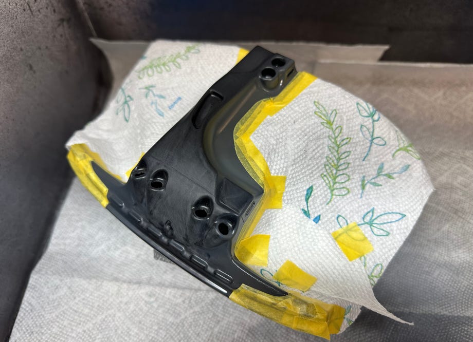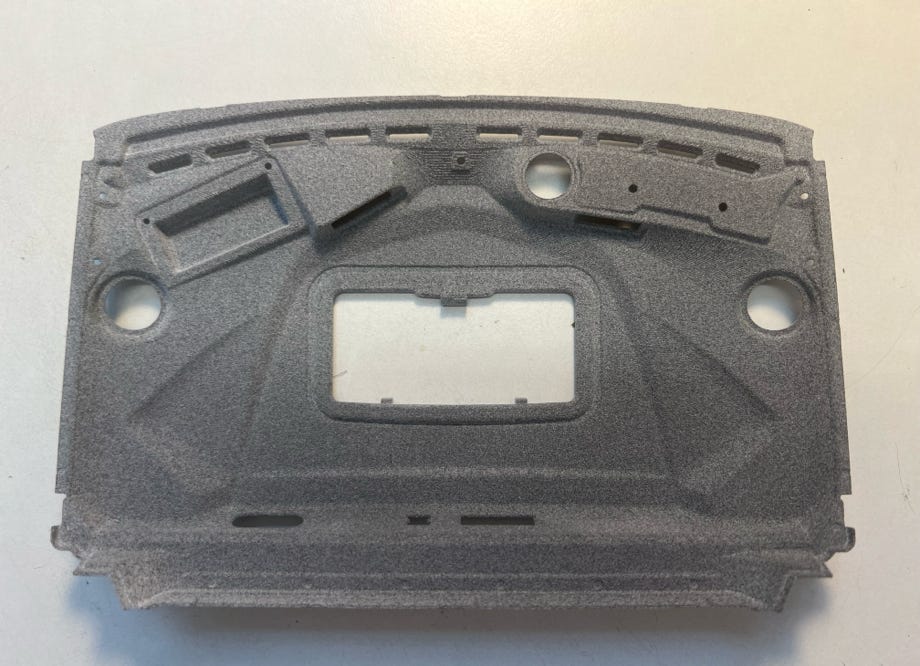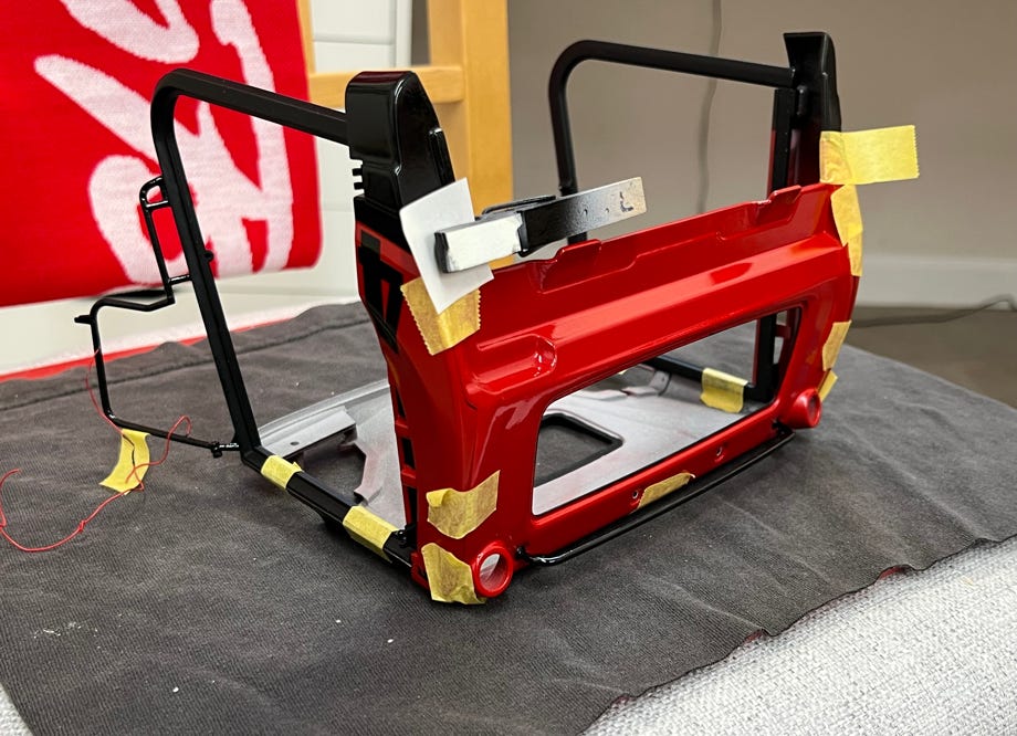 Für die Innenausstattung waren dann noch jede Menge Details zu machen, die ich im Feindruckverfahren herstellen ließ. Diese müssen unbedingt mit Silberfarbe grundiert werden, da sie nicht UV-stabil sind. Bei der Fußmatte sieht man auch, wie man nach einer Grundierung die Drucklinien erkennen und wegschleifen kann.
