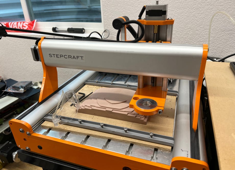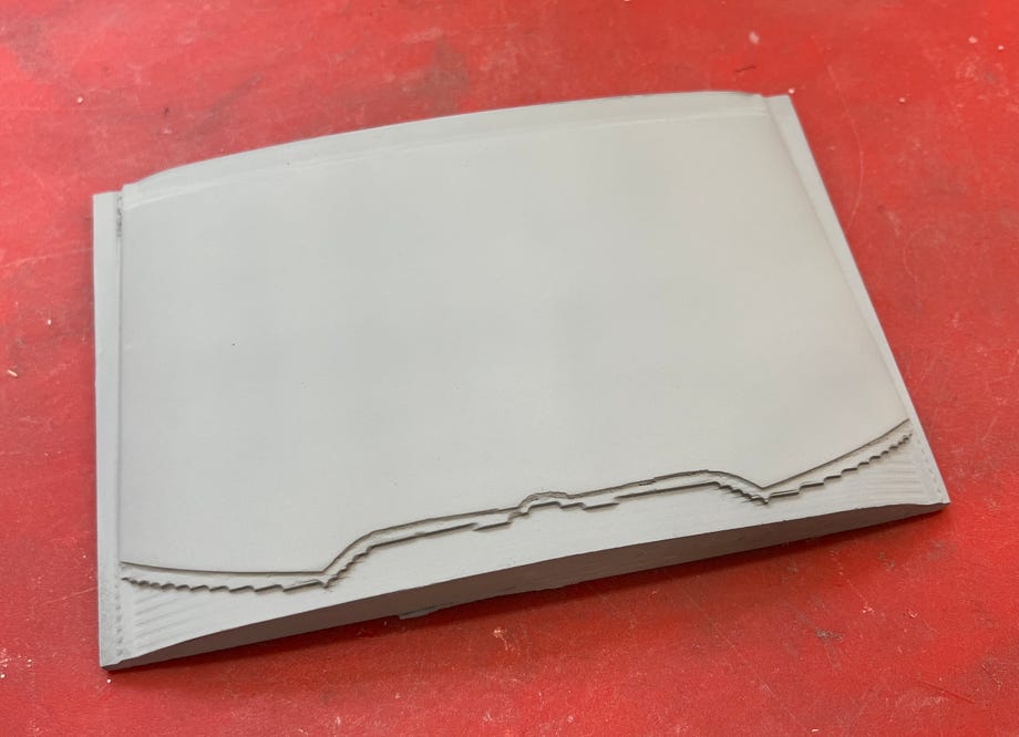 Danach war Glätten der Oberflächen angesagt. Dazu waren lediglich 3 Durchgänge mit Sprühspachtel und 320er Schleifpapier nötig, danach noch eine Feingrundierung und Verschleifen mit 400 und 600 Körnung. Parallel dazu fräste ich die Tiefziehform für die Windschutzscheibe auf meiner Stepcraft 420. Die Form wurde natürlich auch grundiert und fein verschliffen.