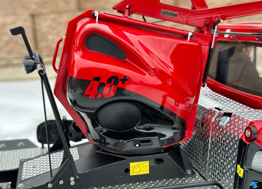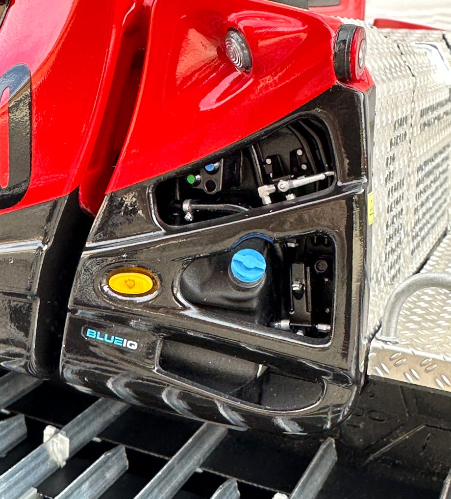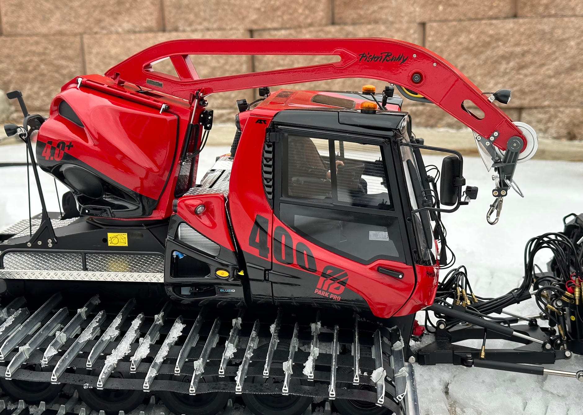 Die Fräse hat beim Original schwarze Finisher, also wurden diese ebenfalls ausgetauscht. Bei der ParkPro Version sind die oberen Teile des Überwurfschutzes schwarz statt transparent, diese waren aus schwarzen Kunststoffplatten auf meiner Stepcraft in CNC schnell hergestellt. Und der Schneideplotter erzeugte die schwarzen PistenBully Logos.
