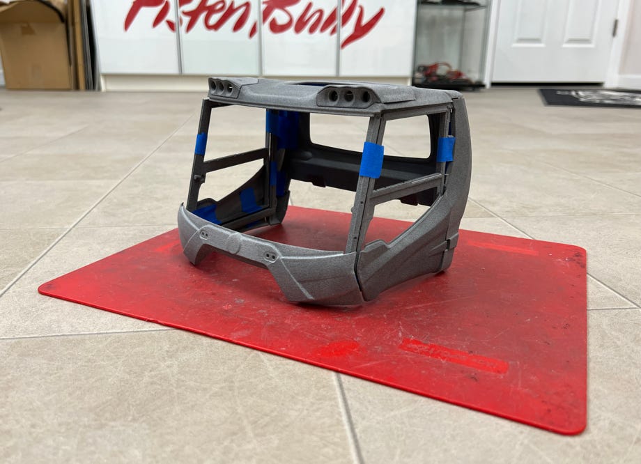 Danach kam die Innenausstattung dran, auch dafür hatten wir die CAD-Daten erhalten. Die Bodengruppe und Mitteltunnel sind exakt dieselben wie beim aktuellen PB600 und konnten damit direkt vom vorhanden Bausatz von Pistenking übernommen werden, ebenso die Sitze. Auch die Bedienkonsole + Joystick ist gemäß dem identischen Bedienkonzept aller PistenBully gleich und war vorhanden. So reduzierte sich die Arbeit auf Rückwand, Dach und Türverkleidungen.