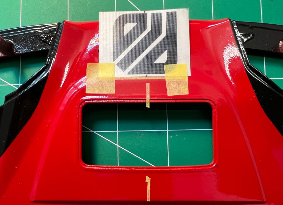 Das Logo und der Schriftzug am Dach wurden aus Vinyl geschnitten und aufgeklebt. Um diese zentrisch und passend ausgerichtet anzukleben habe ich mit schmalen Maskierstreifen Markierungen angebracht.