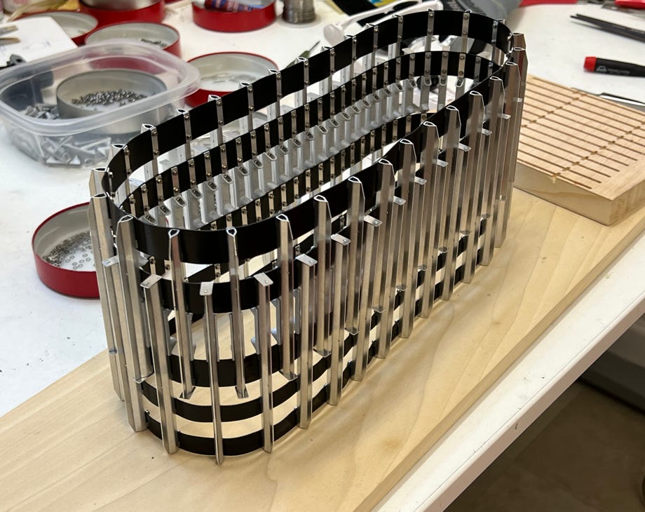 Die Ketten sind eine Augenweide, und enstprechen optisch exakt dem Original. Jeder Steg wird aus 2 präzise gekanteten Blechteilen und einem Endstück zusammengeklebt. Verschraubt werden sie mit winzigen M1,6 Edelstahl-Sechskantschrauben + Beilagscheibe, und das natürlich originalgetreu mit 2 Schrauben pro Gegenblech. Die Spurbügel sind Druckteile, die ich vorher noch silber lackiert habe. Insgesamt waren das 1116 Schrauben für beide Ketten. Das sind die aufwändigsten und schönsten Ketten, die ich bislang zusammengebaut habe.