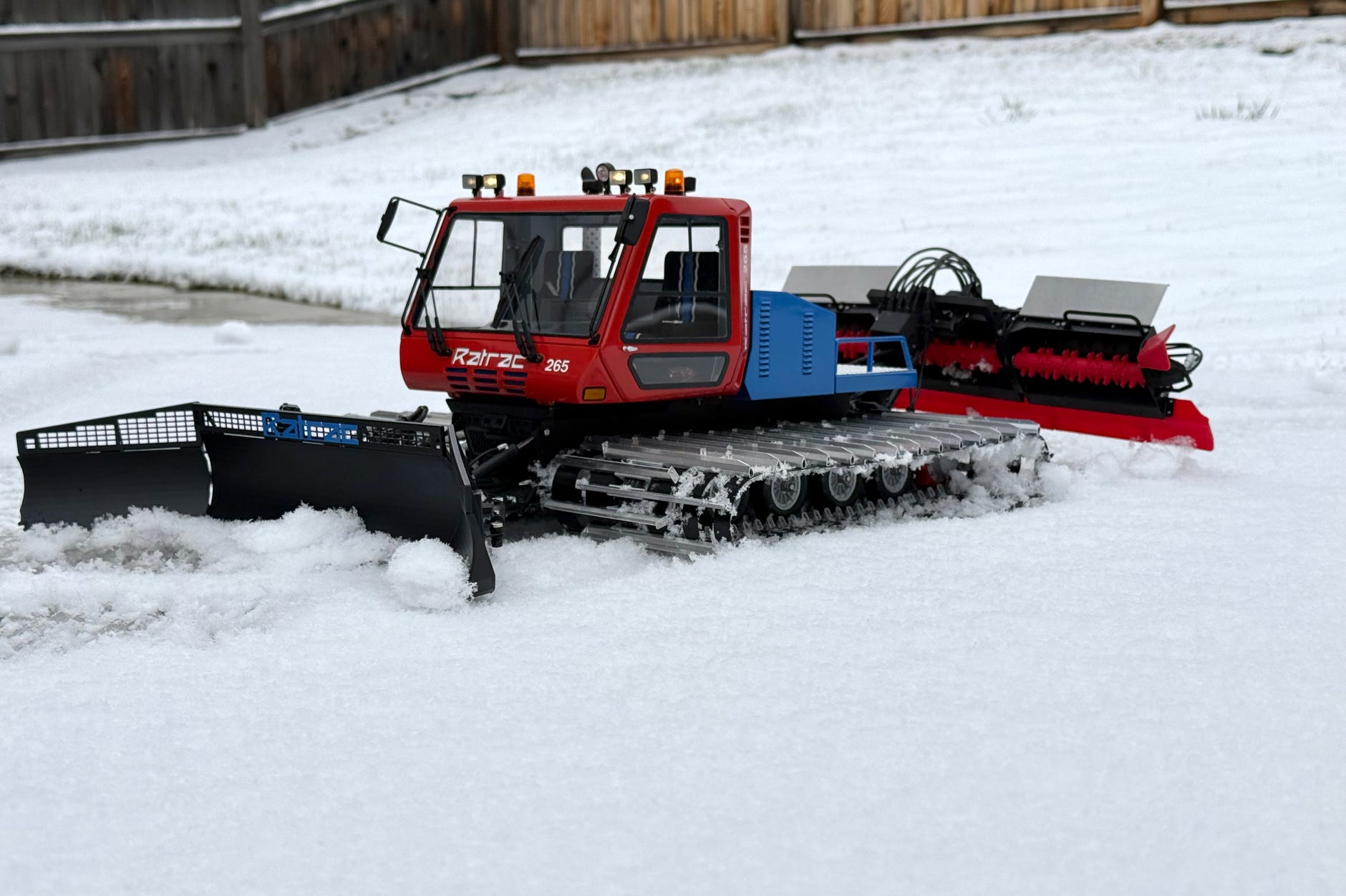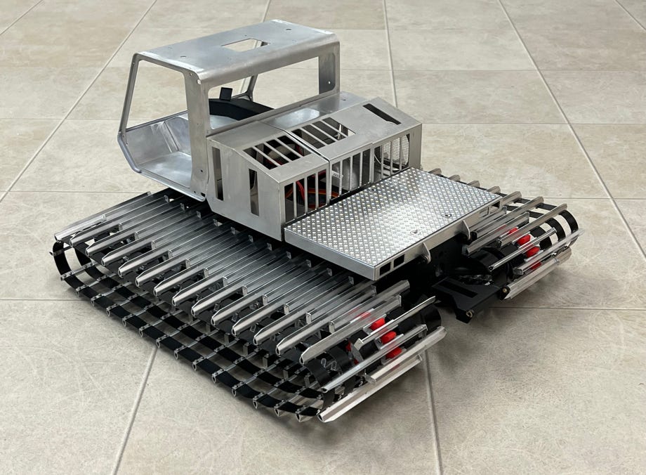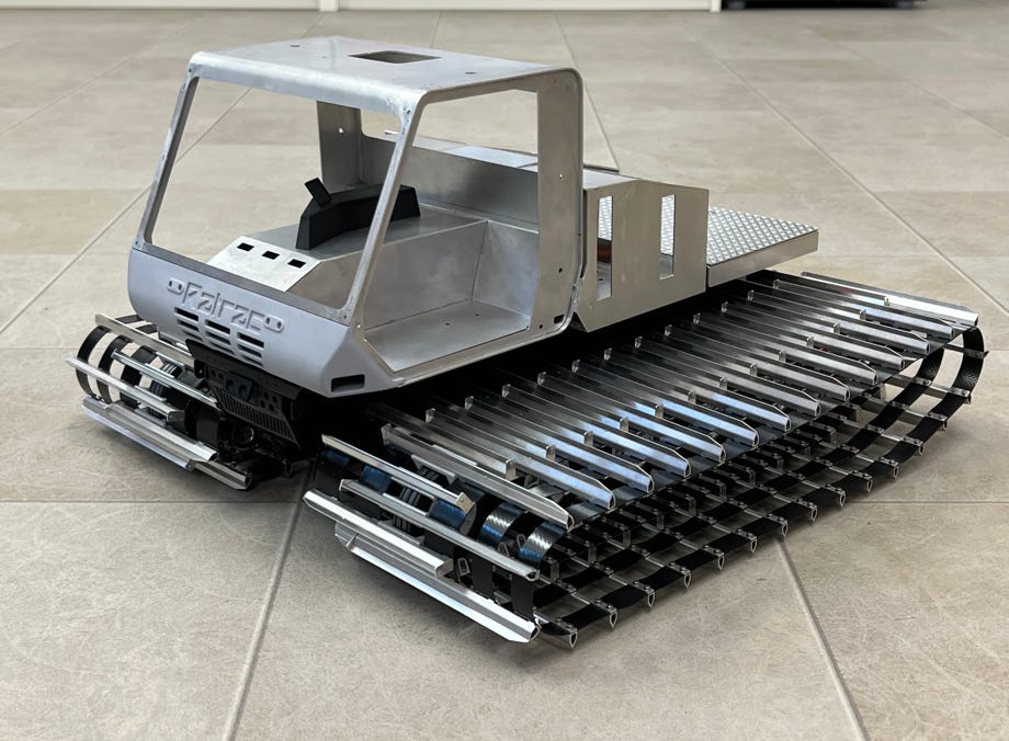 Die Ratrac 265 wurde 1992 erstmals in USA vorgestellt, und zwar als LMC 3700 CF, in Europa wurde sie als Ratrac 265 verkauft. Diese Raupe war ihrer Zeit technisch voraus, allerdings wurde sie auch von einigen Problemen geplagt. Sie war eine der letzten Ratrac Pistenraupen, es folgte nur noch die 400 mit zwar gleicher Kabine, aber anderer Technik. Das Vorbild für unser Modell ist Baujahr 1996 und war noch 2018 an der Ganzsteinschanze in Mürzzuschlag in Österreich im Einsatz, wo es von den Schweizer Modellbauern fotografiert und abgemessen wurde.