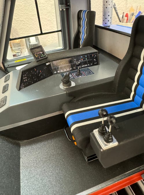 Die Sitze habe ich so wie beim Original-Ratrac lackiert. Für die Armaturenbretter ließ ich Nass-Schiebebilder drucken, das war dann mein Beitrag zu diesem Bausatz.