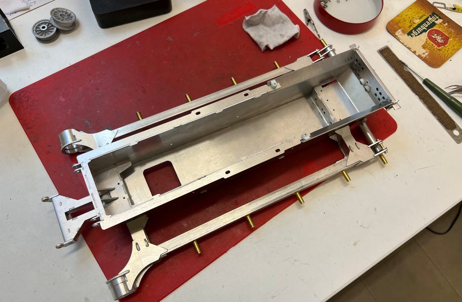 Die Karosserie ist stabil aus Alublech aufgebaut und wurde von Adrian perfekt gekantet. Sie passt nämlich ohne Spalte auf die Seitenteile. Die Frontschürze und die B-Säulen sind Nylon-Druckteile.