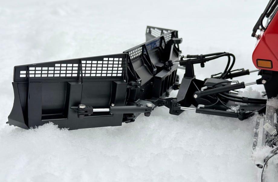 Der Geräteträger ist auch deutlich länger, damit befindet sich die Fräse auch weiter vom Fahrzeug entfernt. Der Hubzylinder arbeitet hier auf Zug und ist deshalb massiv ausgeführt. Das macht es für den Modellbauer einfacher: das Seil zum heben bleibt in der Wanne und damit unsichtbar.