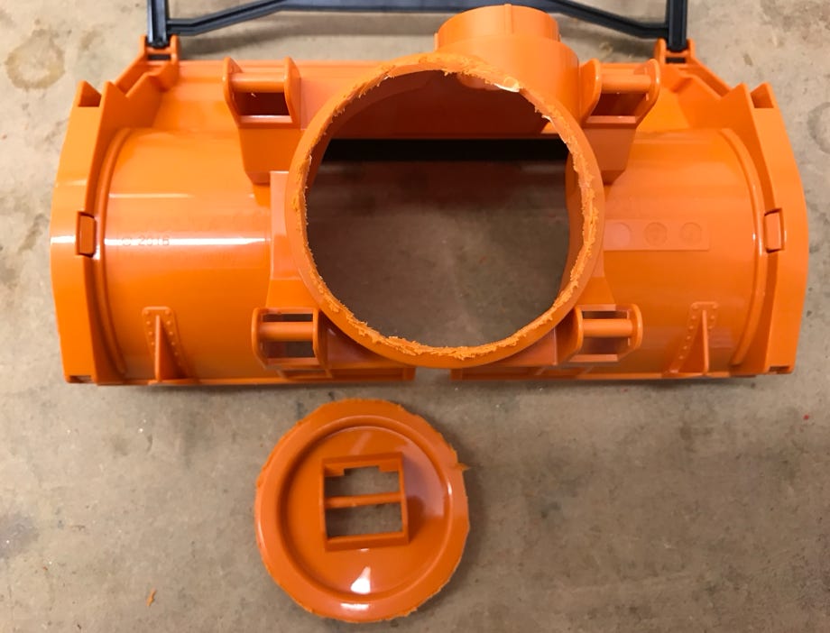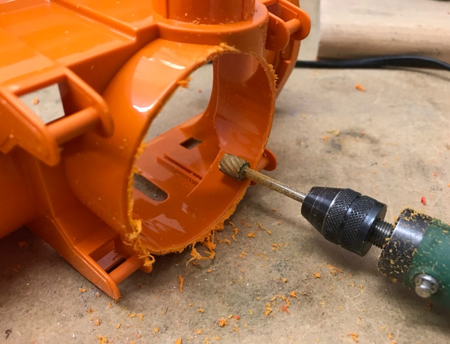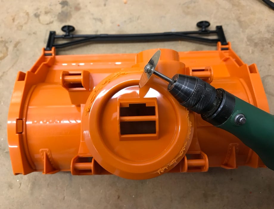 Zunächst muss die Schneeschleuder zerlegt werden: die Teile sind über Klipps miteinander verbunden, welche sich mit einem Schraubenzieher ein- bzw. auseinander drücken und lösen lassen. Die Klipps der Schälschnecken-Endscheiben werden später nicht mehr benötigt, ich habe sie daher kurzerhand abgezwickt. Nachdem die Schälschnecke zerlegt ist, kann das eingeklippste Mittelteil entfernt werden. Mit meiner Proxxon Micromot und entsprechenden Säge- und Fräseinsätzen habe ich dann das Gehäuse ausgehölt, siehe Bilder: