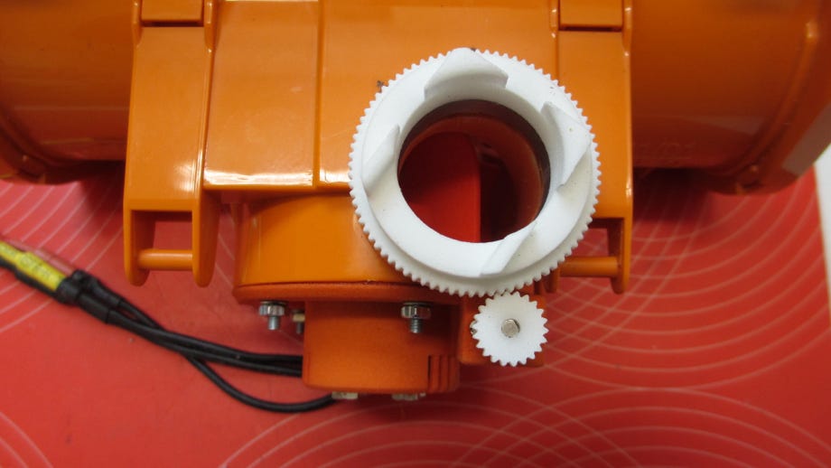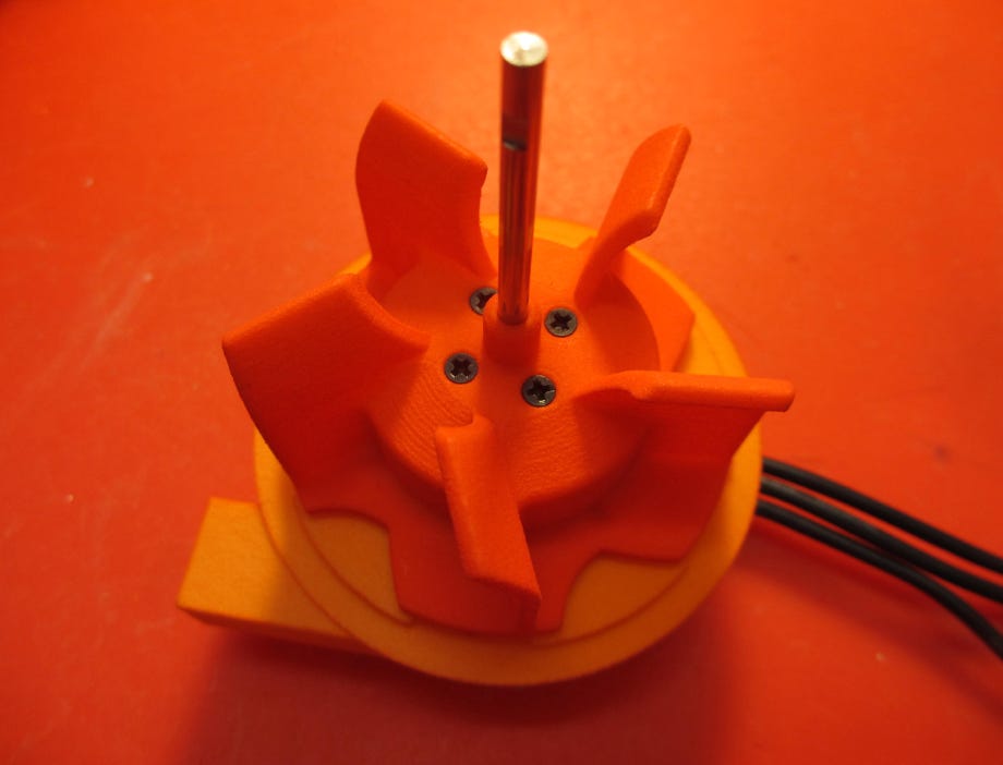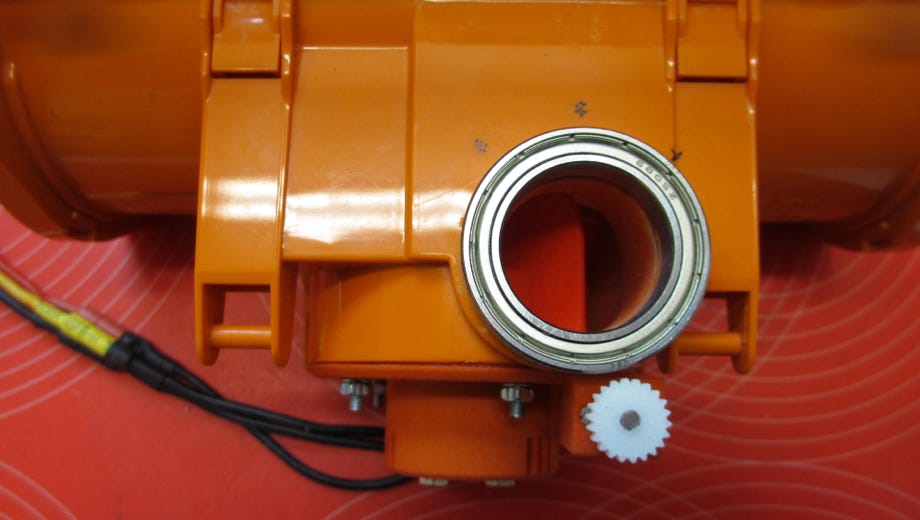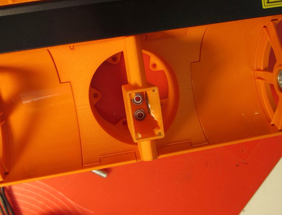 Ein Dünnring-Kugellager mit 25 mm Innendurchmesser erlaubt das Drehen des Kamins, die Verstellung erfolgt ferngesteuert über einen 1:50 Getriebemotor, der in das genau passende Gehäuse montiert wird. Mittels einer gedruckten Hülse wird das Kugelllager zuverlässig in der richtigen Position fixiert. Die Hülse wird mit dem Auswurfschacht und dem Innenring des Kugellagers verklebt.