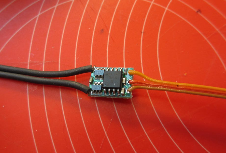 Die Fahrtregler für die Kaminverstellung sind winzig und haben den Vorteil, dass man sie direkt an den Empfänger anstecken kann, es müssen lediglich die Kabel mit einem Servostecker angelötet werden (siehe Foto unten).