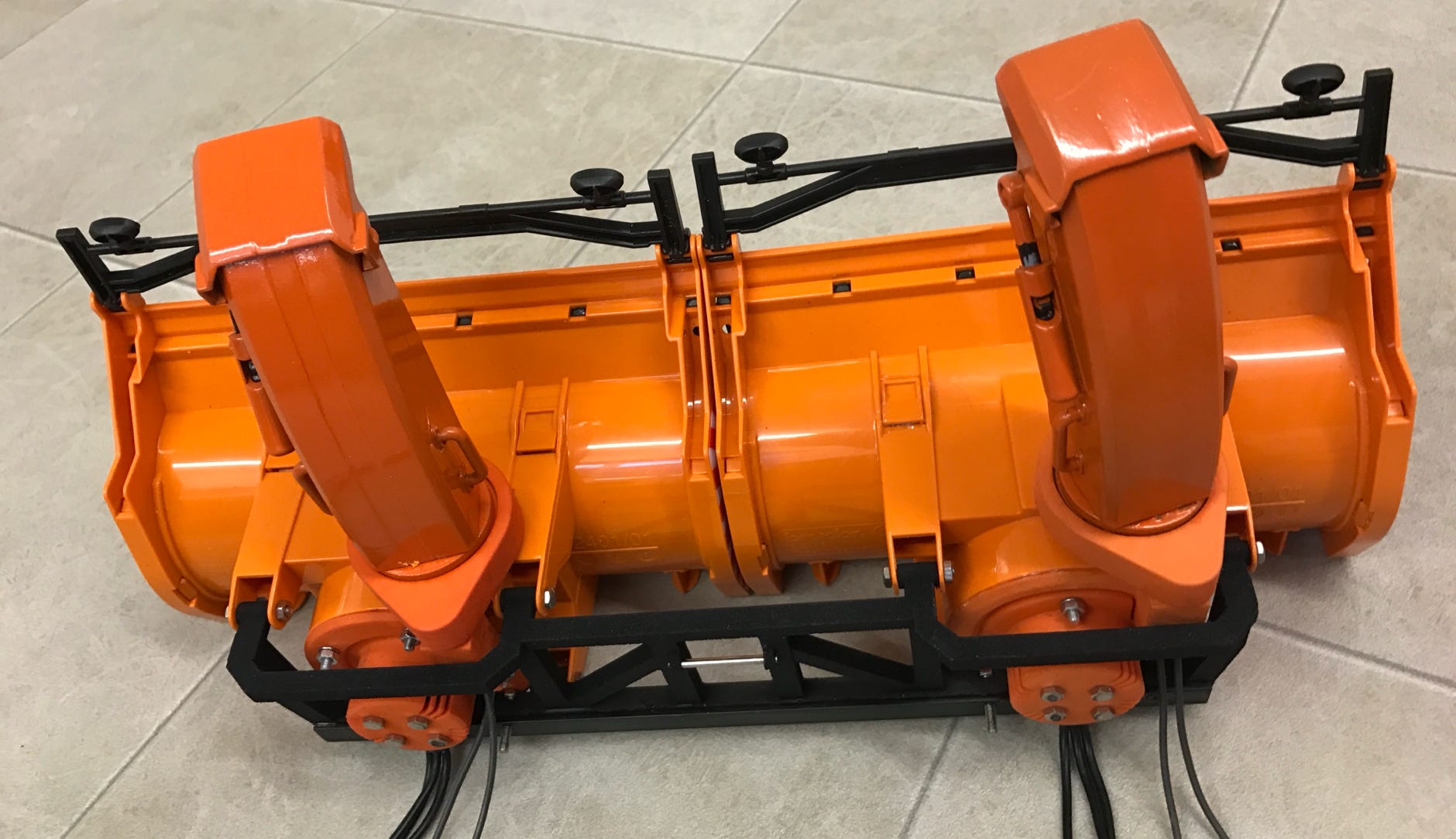 Mehrere Kollegen haben bereits einen Umbau durchgeführt, und Klaus Bergdolt hat darüber ausführlich in der Truckmodell 2/2017 berichtet. Motiviert von seinem Bericht beschloss auch ich einen Umbau, aber es sollte eine Doppelschneeschleuder werden, und zufällig von der Breite perfekt an ein PistenBully Modell in 1:12 passt. Klaus hat das Wurfrad und Gehäuse aus Dünnblechteilen hergestellt, wozu mir die Kenntnisse und Maschinen fehlen. Daher habe ich diese Teile im CAD gezeichnet und drucken lassen.