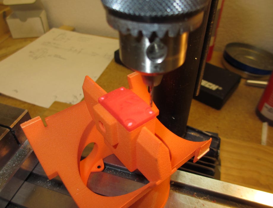 Zur Montage des Getriebedeckels sind M2 Gewinde in das Gehäuse zu schneiden, dazu zuerst mit einem 1,5 mm Bohrer bei aufgelegtem Deckel vorbohren, danach kann der Deckel auf 2 mm aufgebohrt werden. Dann kann das Motorritzel eingefädelt werden. Zum Anziehen der Madenschraube am Motorritzel ist eine kleine Bohrung im Gehäuse. Danach wird die Schneckenwelle und zum Schluss das Schneckenrad in Position gebracht. Zwischen Schneckenrad und Kugellager muss eine 1,2 mm dicke Beilagscheibe eingefügt werden.