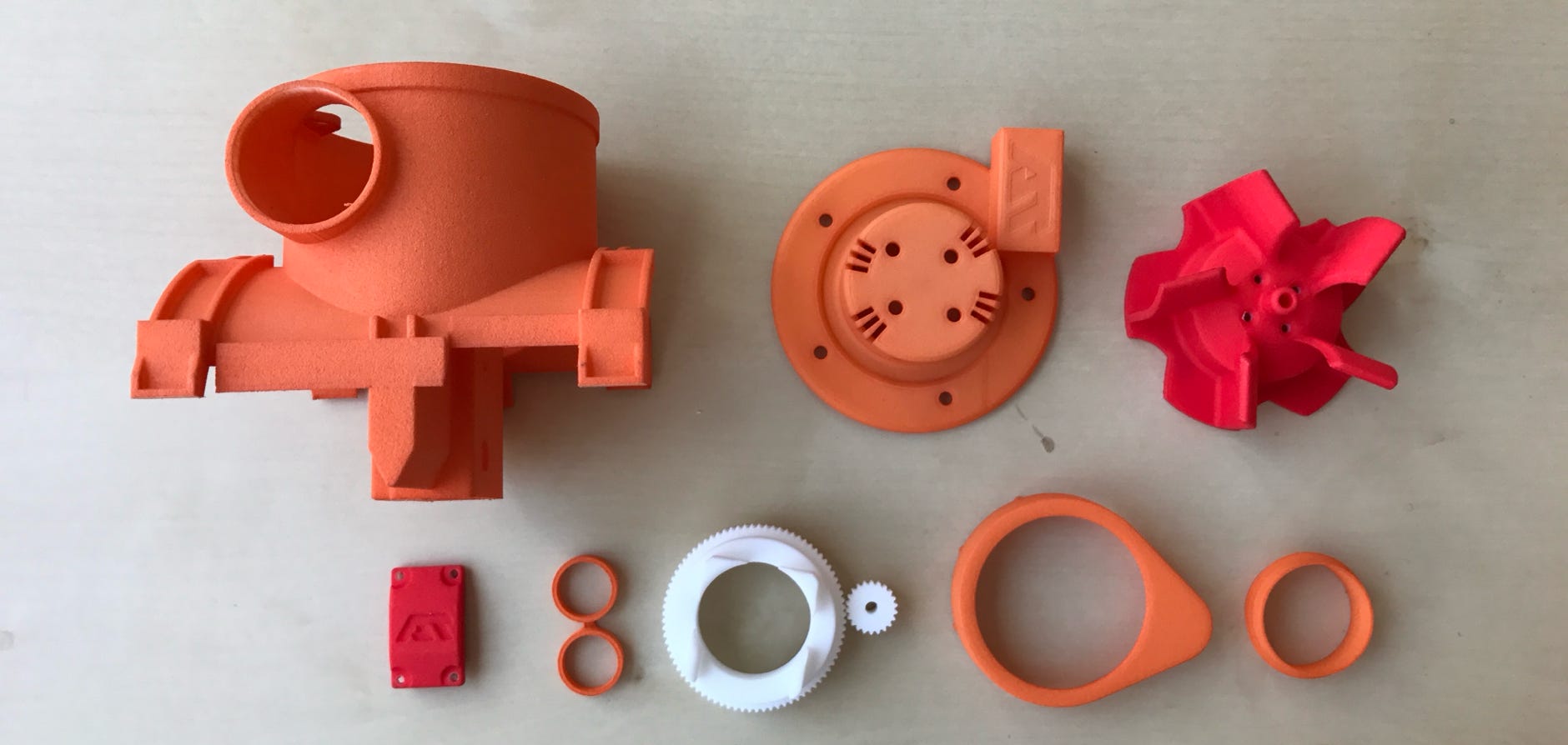 Die benötigten Druckteile habe ich im CAD passgenau konstruiert: Wurfradgehäuse mit Schneckenradgetriebe, Motorhalterung, Wurfrad, Getriebedeckel, Lagerdistanzringe, Kaminsockel mit Ritzel, Abdeckung und Kaminlagerhülse. Diese ließ ich aus Nylon-Sinterdruck herstellen und gleich passend einfärben:
