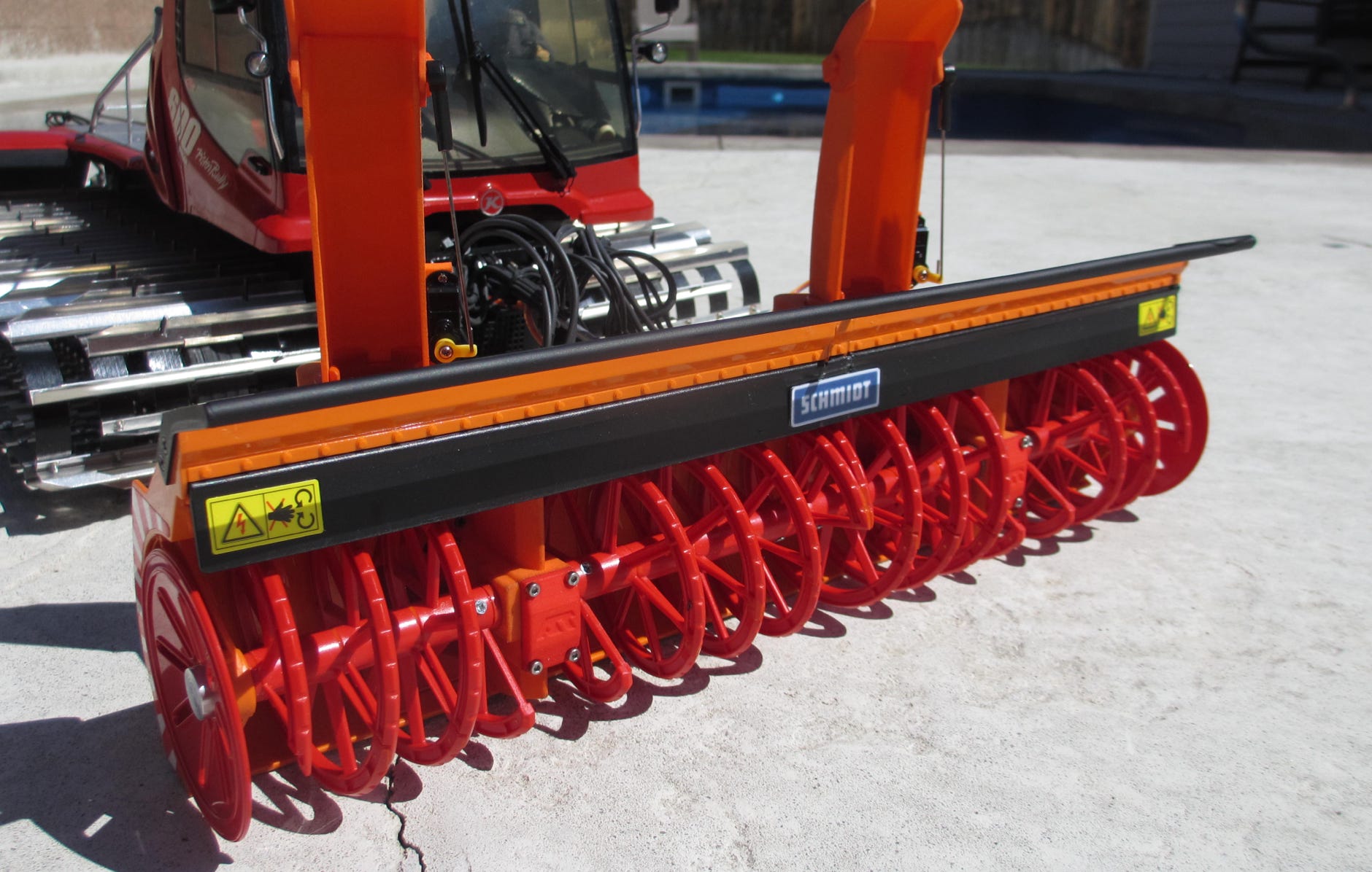 Jede Schleuder wiegt etwa 375 Gramm und beide können noch leicht vom Hubservo angehoben werden. Die wuchtige Schleuder passt größenmäßig recht gut an meinen PistenBully 600 Polar.