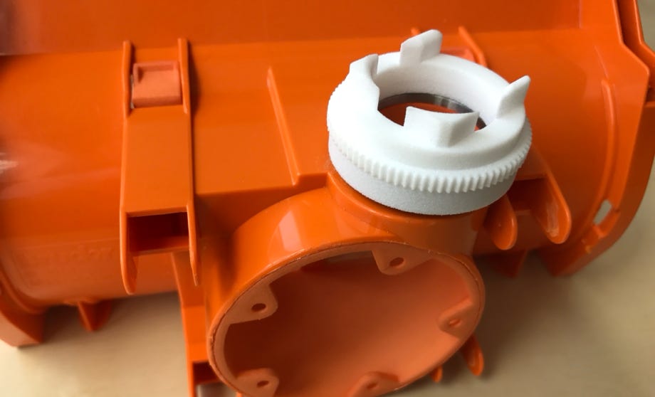 Die richtige Positionierung des gedruckten Wurfradgehäuses an das Schleudergehäuse ist durch das Einklippsen sichergestellt. Aus optischen Gründen sollte die hintere Kante des eingeklippstem Mittelteils bündig mit der Hinterkante des Schleudergehäuses abschließen. Wer auf Nummer Sicher gehen will, kann die Teile miteinander verkleben, aber erst nachdem die Schälschneckenwelle bündig eingepasst wurde (siehe weiter unten).