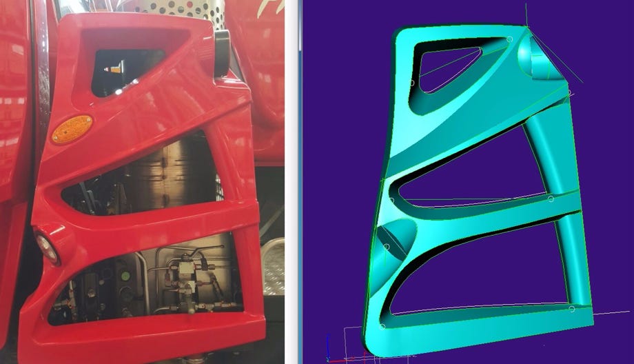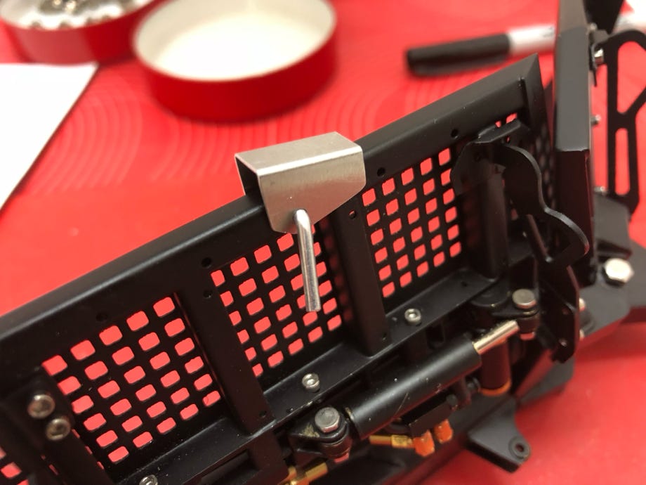Die Blechteile des Rucksacks wurden im CAD erstellt und dann aus speziellem Riffelblech gelasert. Der Auspuff wurde als 3D-Druckteil gefertigt. Ein paar weitere Details wie zB der Tankstutzen für den Urea-Tank wurden als Gussteile erstellt. Dazu wurden sie zuerst in High Definition Acrylate gedruckt, einer neuen Drucktechnik die feinste Details zulässt, und dann in Silikon abgeformt. Wegen der großen Lufteinlässe habe ich die sichtbaren Details hinter den Lufteinlässen in CAD modelliert und drucken lassen. Fahrerseitig sieht man die Hydrauliksteuerung zum Anheben der Fahrerkabine und Plattform, und beifahrerseitig befindet sich der Motorkühler inlusive Vorwärmstecker.
