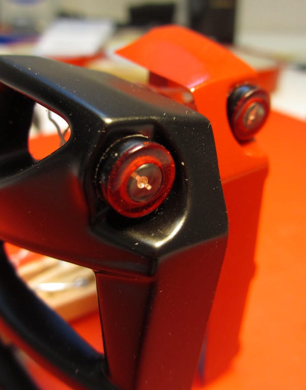 Eine Herausforderung waren die Kombirückleuchten, die beim Original aus einem Ring mit LEDs für das Rücklicht und dem Blinker im Zentrum bestehen. Die Gehäuseteile habe ich im CAD gezeichnet und dann drucken lassen, die Bohrungen im Ring simulieren dabei die LEDs vom Original, was recht gut wirkt, wie man im Bild oben erkennen kann. Als Rücklicht dient eine rote 1,8 mm LED, das Blinklicht besteht aus einer orange leuchtenden 5 mm LED, die ich passend plangeschliffen habe. Das rote Glas wurde ebenfalls gedruckt, in Silikon abgeformt und dann mit rot eingefärbtem transparentem Harz gegossen. Dieses Harz muss für 90 Minuten im Ofen bei 70°C ausgehärtet werden, also alles in allem recht aufwändig.