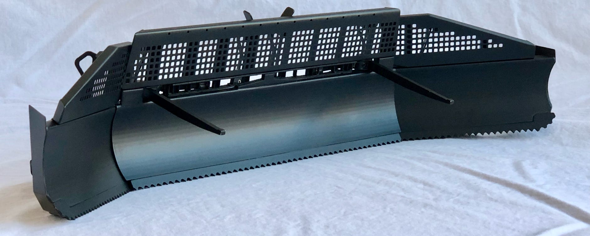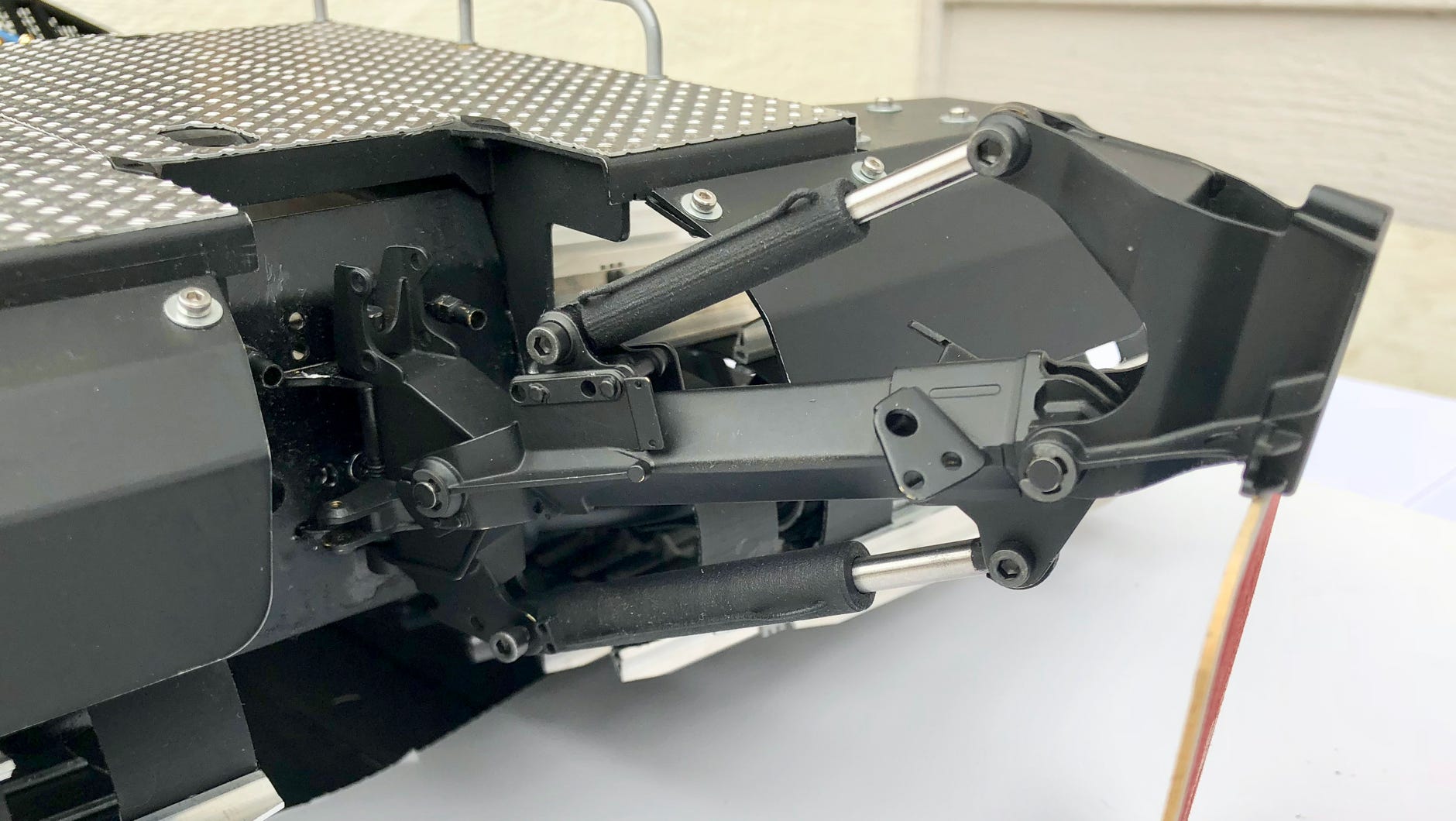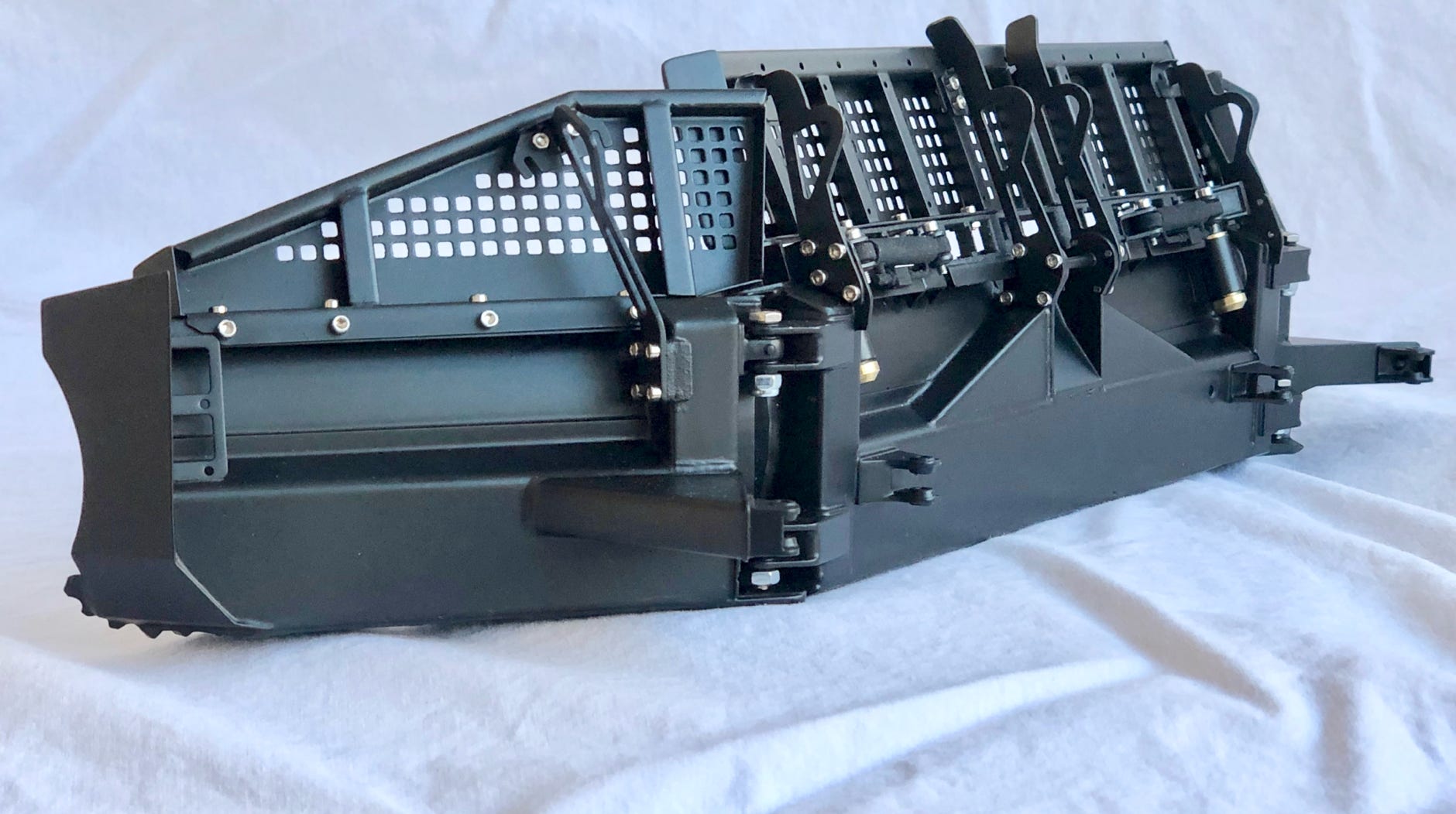 Die Karosserie und eine fetzige Lackierung allein machen noch keinen ParkPro. Für die Parkbearbeitung sind enorme Verfahrwege von Schild und Fräse notwendig, und deshalb hat Kässbohrer für die ParkPro-Version einen verlängerten Schubrahmen und ein spezielles Räumschild entwickelt. Diese Teile zu machen entpuppte sich als schwieriger und aufwändiger als ich ursprünglich dachte.