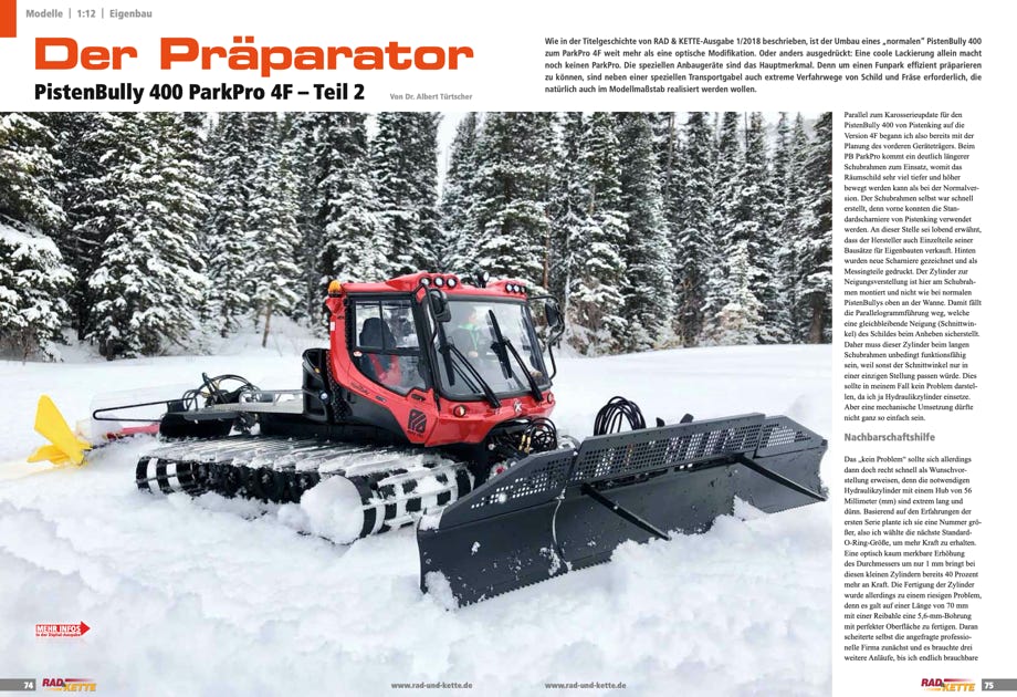 Im Fachmagazin Rad & Kette 1/2018 und 2/2018 ist ein zweiteiliger Artikel von mir über den Bau des PB400 ParkPro 4F veröffentlicht worden. Teil 1 ist über den Bau der Karosserie, und Teil 2 über die Anbaugeräte und Hydraulik.