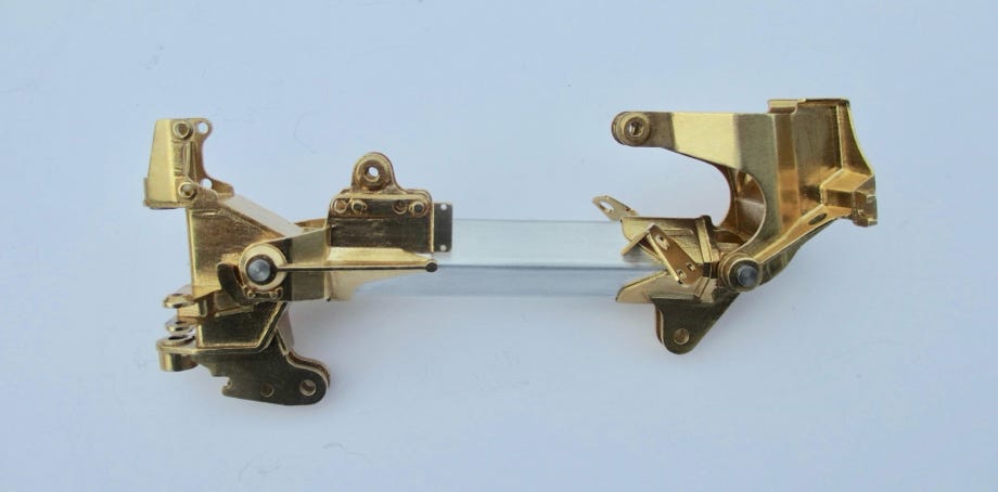 Der Gabelmechanismus besteht hauptsächlich aus filigranen Nylon-Druckteilen, die aber erstaunlich stabil sind. Die Gabeln sind aus Aluminium und in Halterungen aus Messingdruckteilen geklebt. Jede Gabel ist zweifach kugelgelagert.