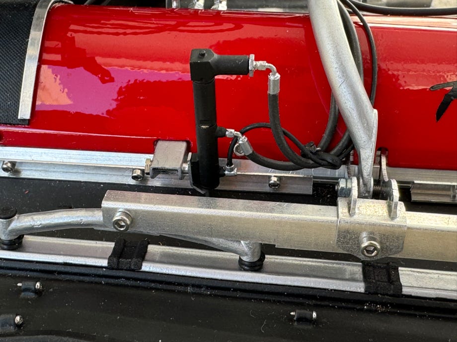 Die Montage der Halterungen erfolgt im Abstand von 43,9 mm von der Innenseite des Fräskastens, siehe Zeichnung. In die roten Abdeckungen muss eine entsprechende Aussparung geschnitten werden (siehe Foto oben). Die Halterungen werden mit einer kurzen M1,6 Schraube am Fräskasten befestigt. In die Flapzylinder wird zur Befestigung ein M1,6 Gewinde geschnitten und diese mit einer M1,6x10mm Schraube an der Halterung befestigt. Die Kolbenstangen werden in die Bohrungen geklebt, beim linken Zylinder kommt auch oben ein Stück Kolbenstange hin.
