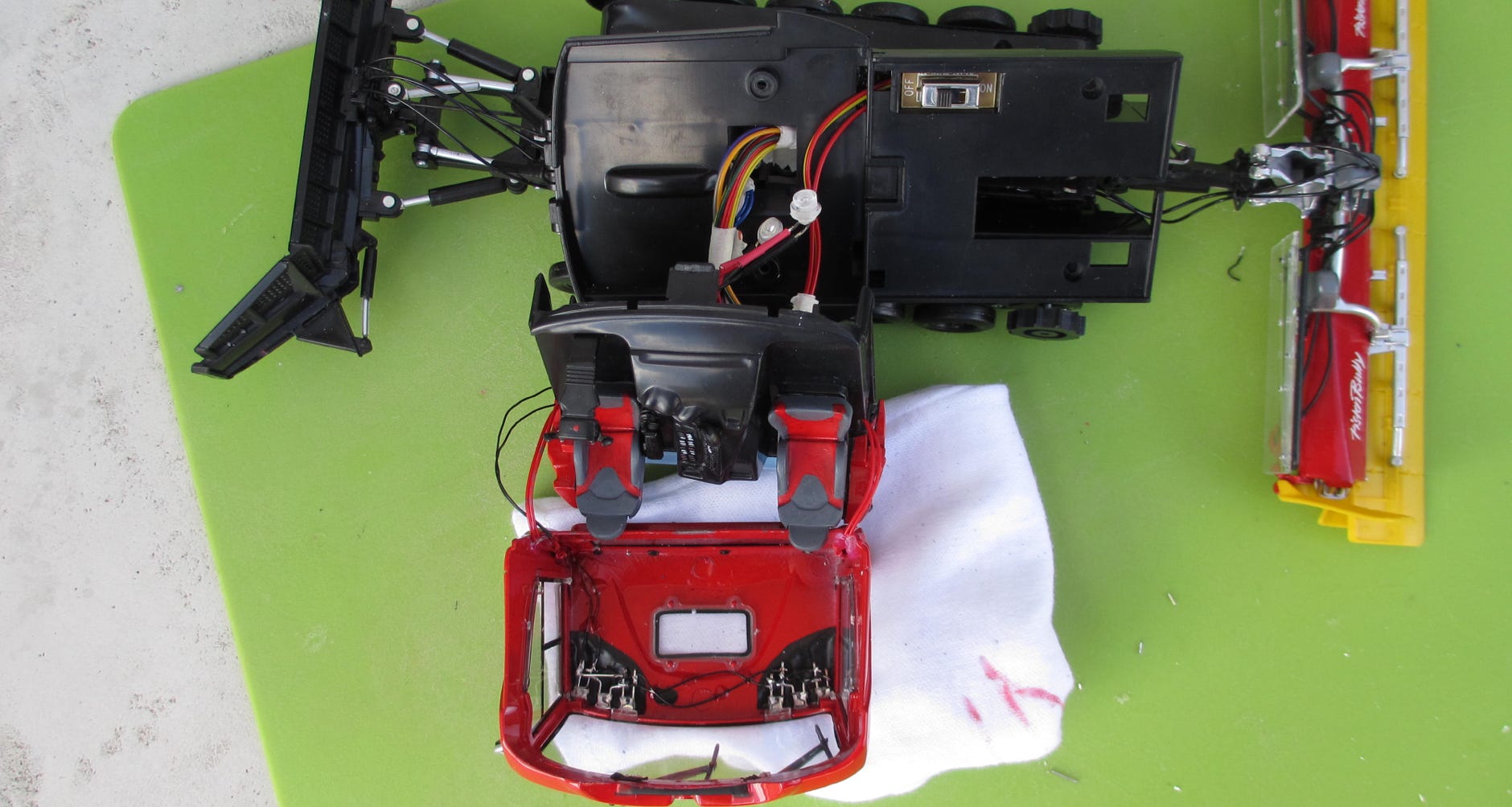 In spring 2022, I replaced the original electronics. The stiff wires kept breaking at the solder joints, and the included remote control didn't allow for precise control. I installed micro receivers, speed controllers, and switches from Sol Expert Group. This allowed me to use my Spektrum DX transmitter for control.